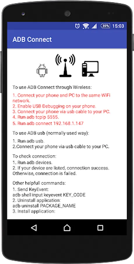 To use adb via WiFi: run ADB Connect and follow the instruction