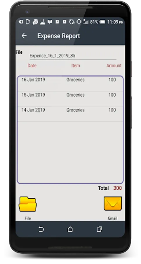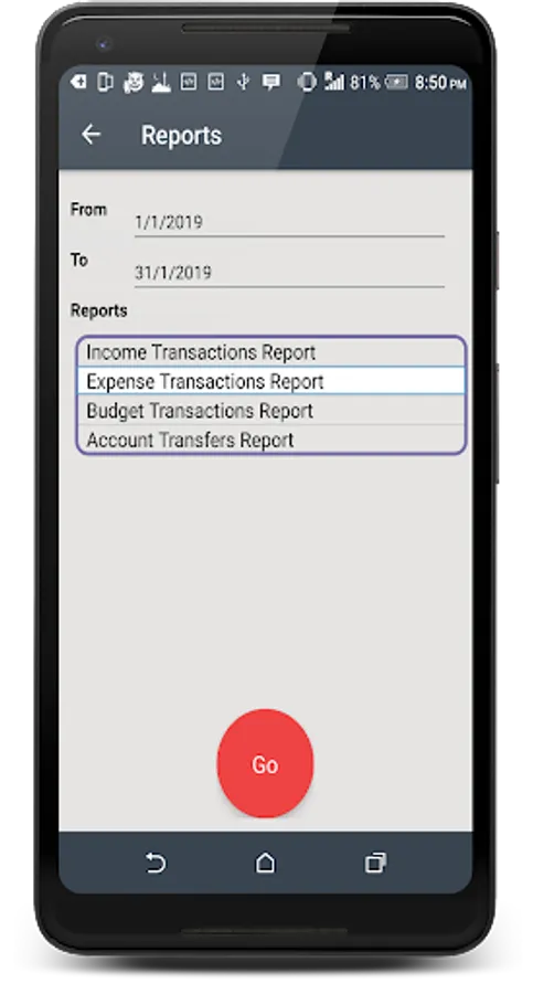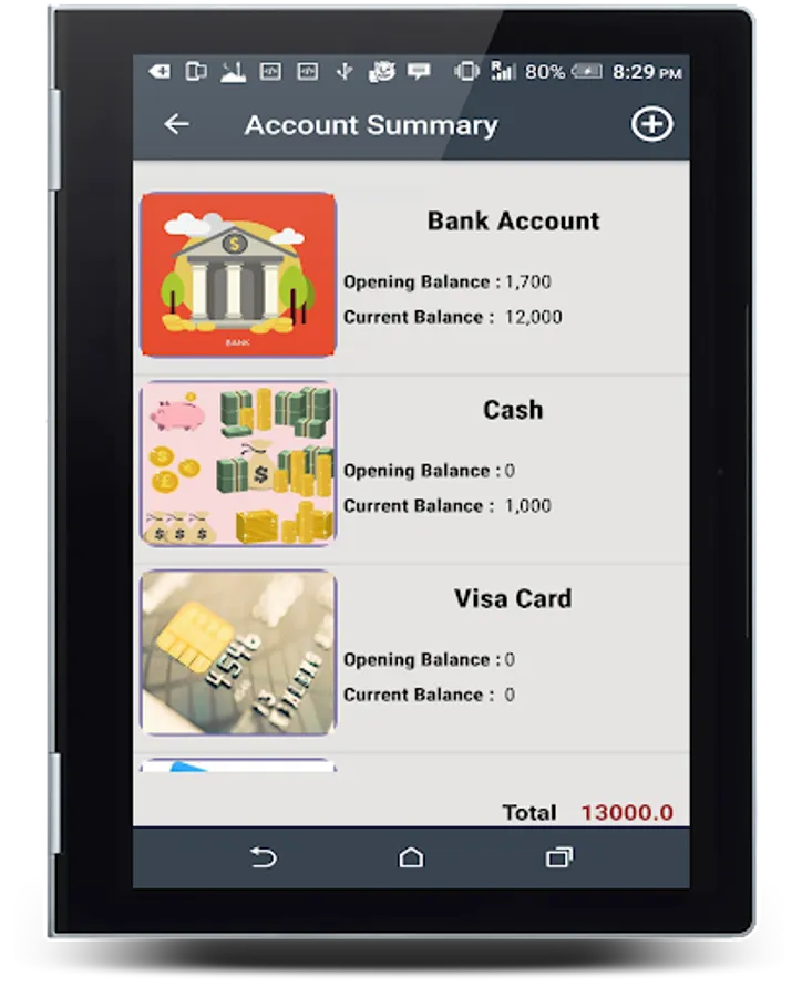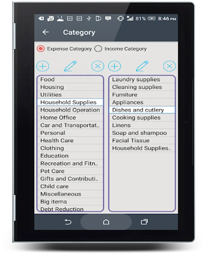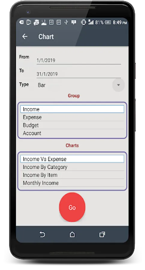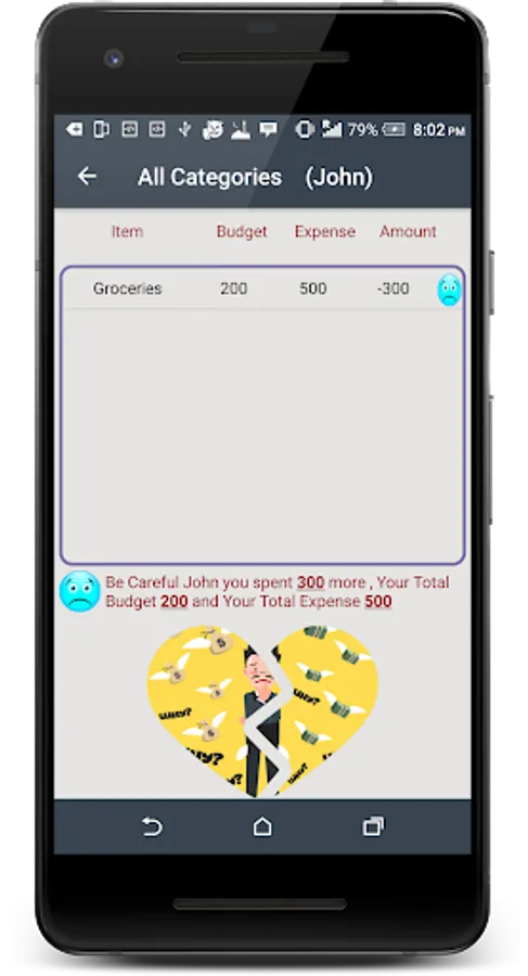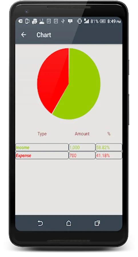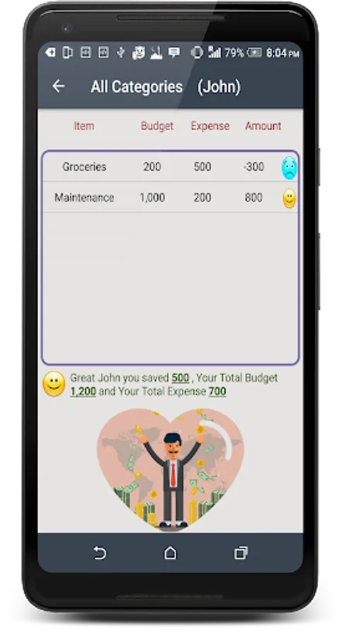 o Screen with great graphic to control your expense and compare it with your budget, It will show you which item exceeds your budget to help you to control it.