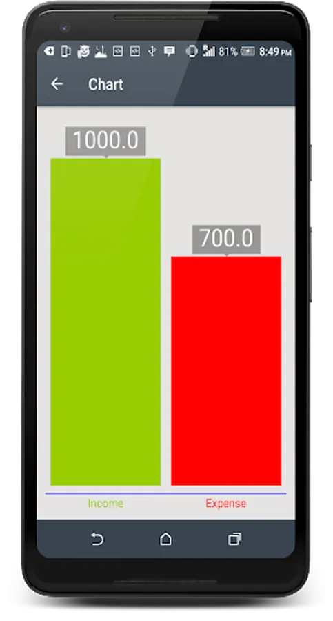 o Screen with great graphic to control your expense and compare it with your budget, It will show you which item exceeds your budget to help you to control it.