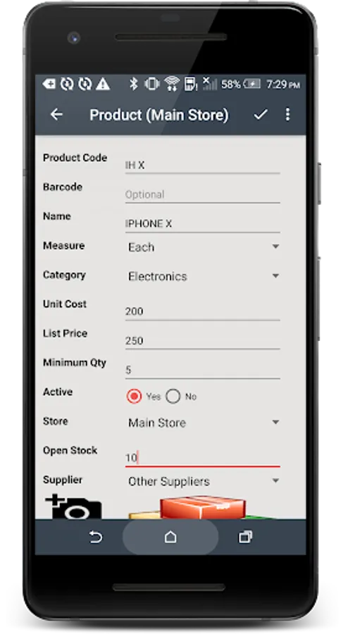 o Products: Create product integrated with barcode reader program to use barcode also you can store product image.