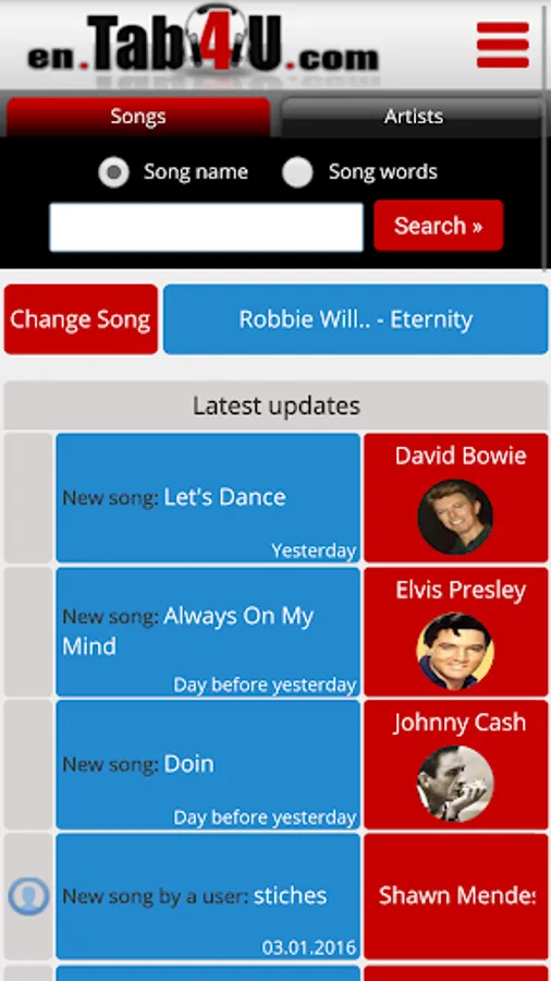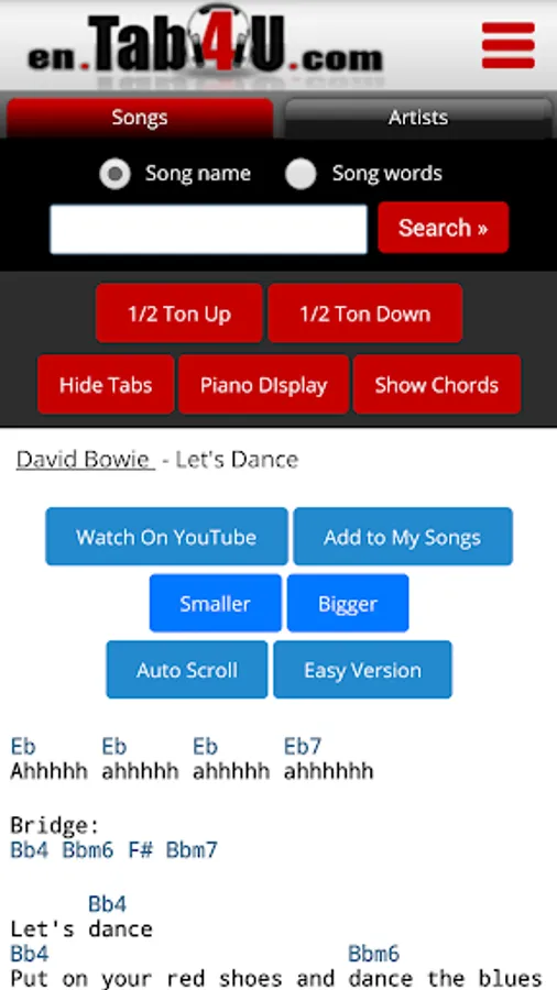 EN.TAB4U.com is an app and a website that gives chords, tabs and lyrics for Thousands of songs.