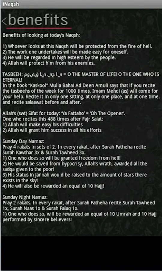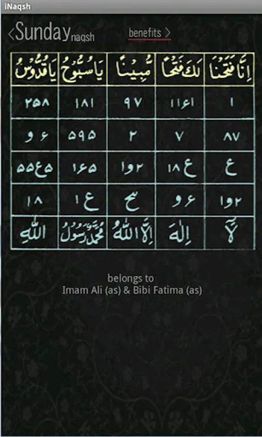 A phone is probably the first thing that you see in the morning. We have made this app keeping this in our mind so that one can start the day with the blessings of Allah and Ahlulbayt by looking at the Naqsh of the day which this app automatically displays. Each day belongs to Masoomeen. This app will tell you all the details and what you should do that day with suggested Duas and Namaz. You can share the Naqsh to your friends and familiies through Social media or the messaging.