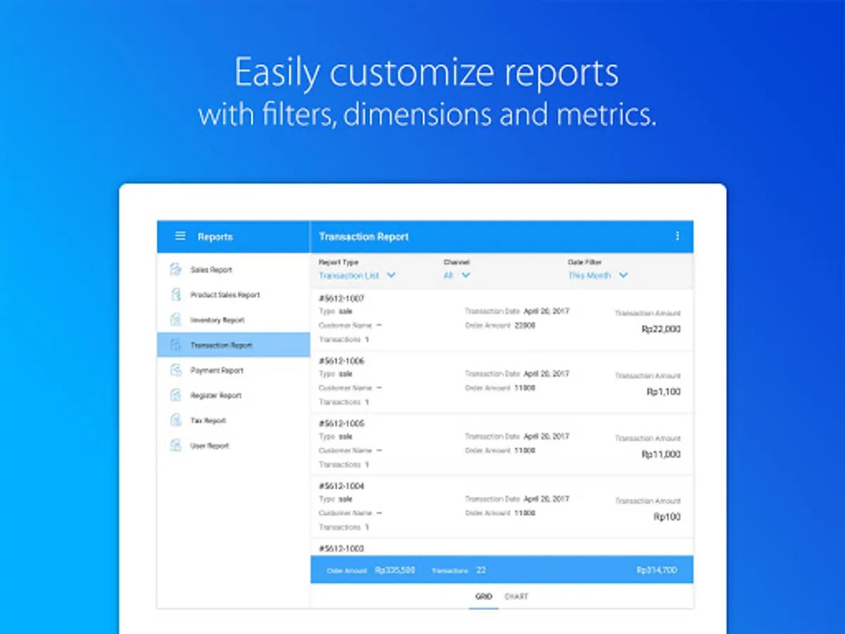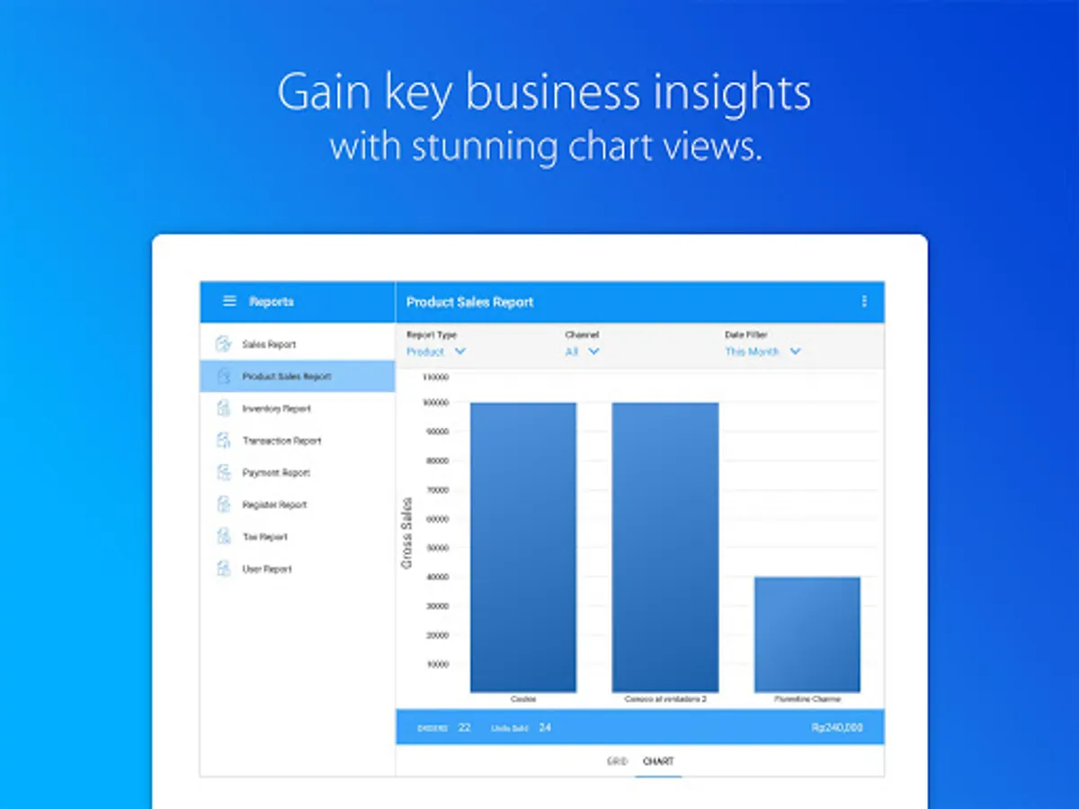 • Access comprehensive reports, from sales, inventory to user reports.