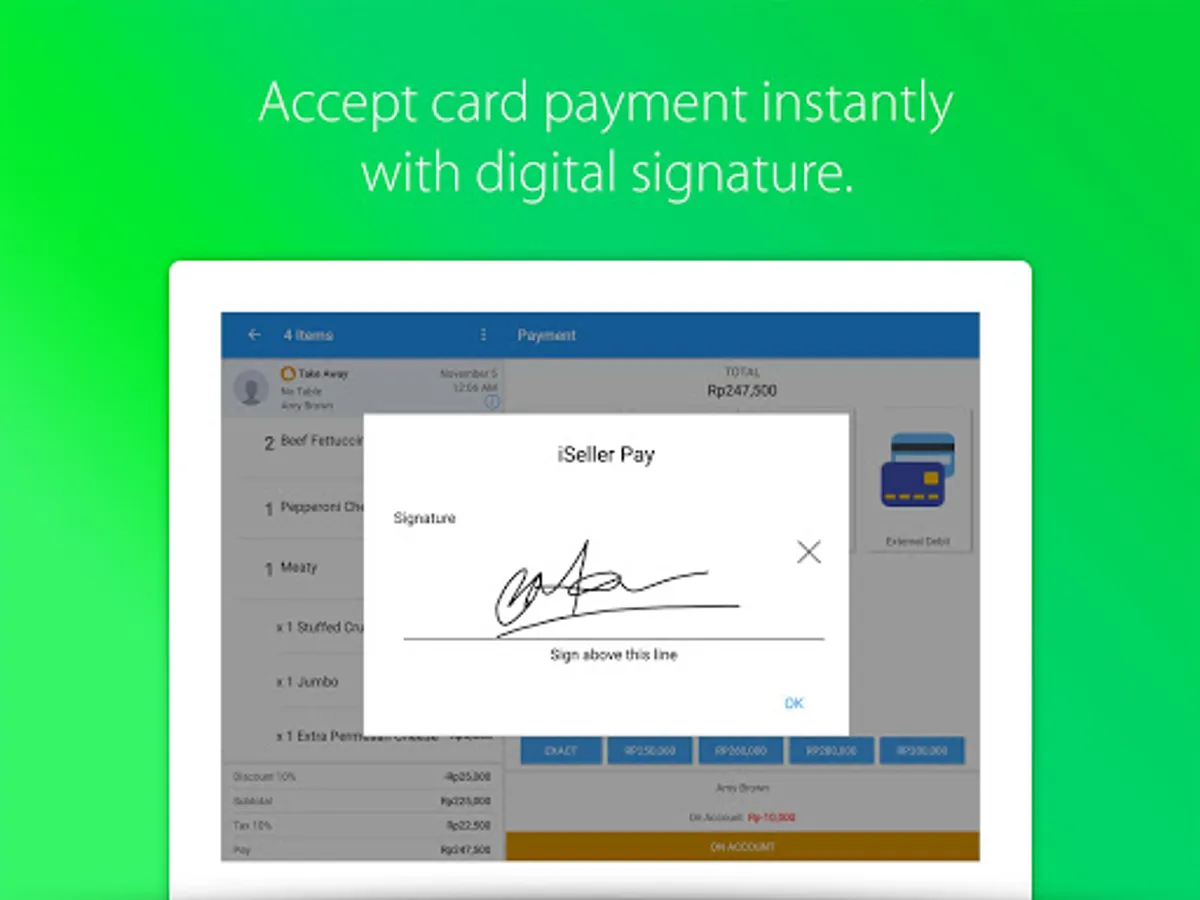 • Accept card payment instantly with integrated card reader and capture digital signature.