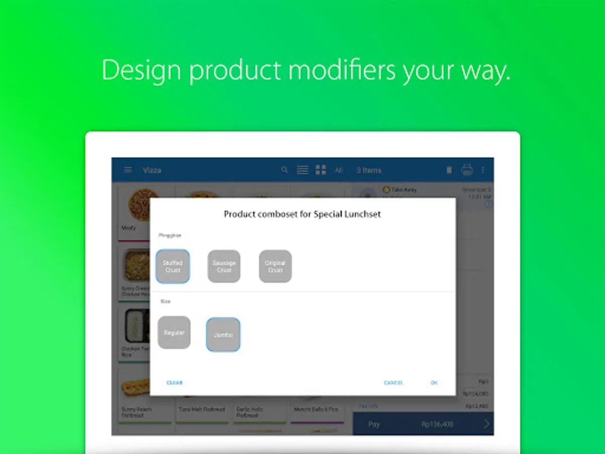 • Support unlimited product modifiers with grouping capability, minimum and maximum selection, price addition, and more.
