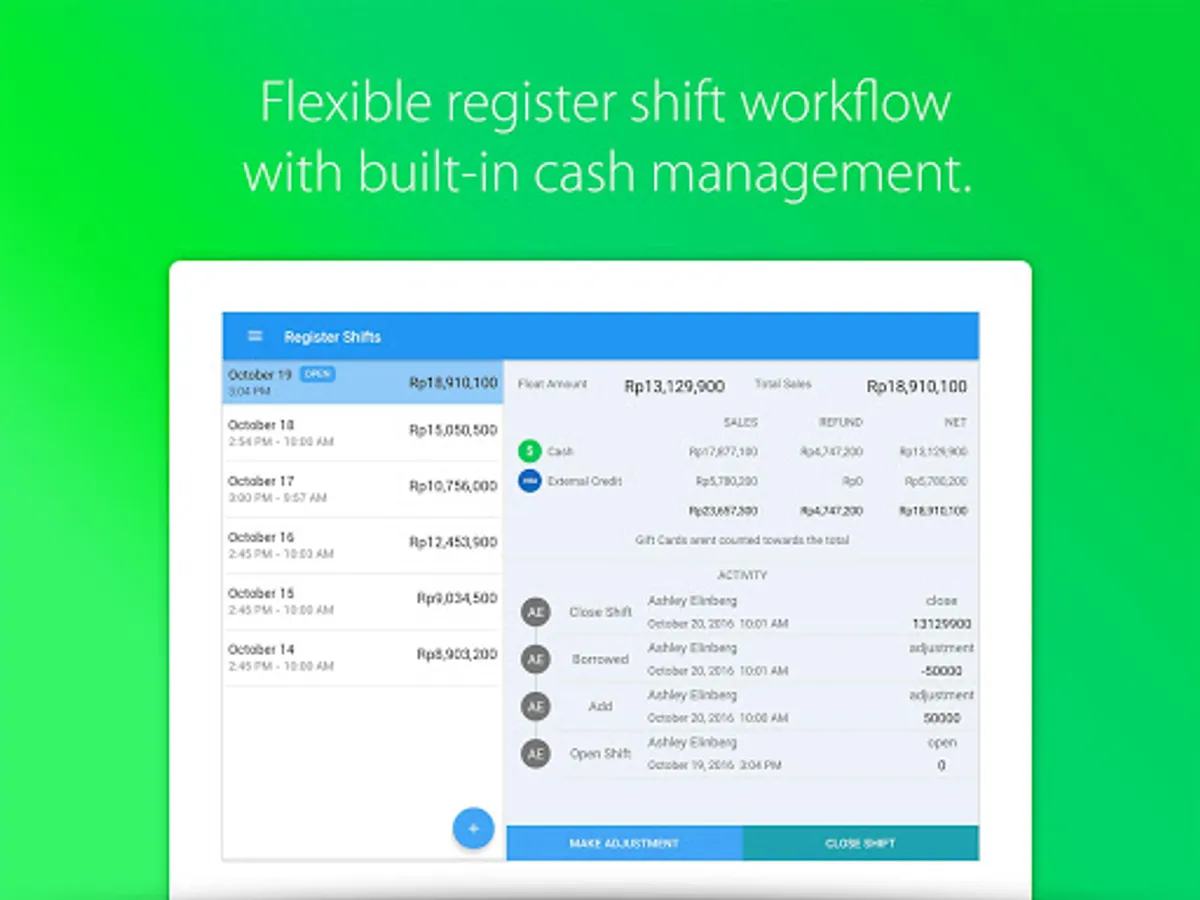 • Track cash register activities with flexible register shift workflow supporting cash adjustments, register shift closing, and expected cash count.