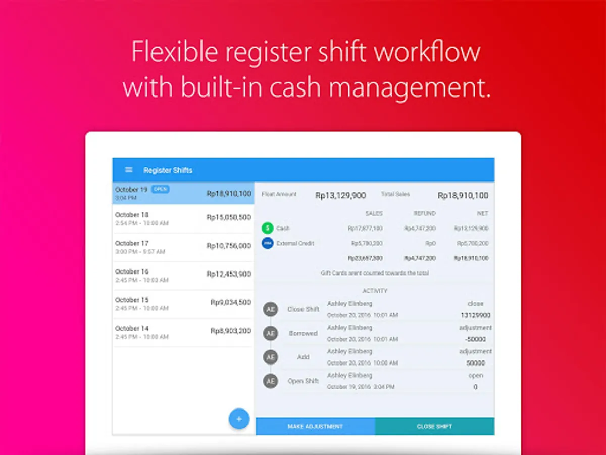 • Track cash register activities with flexible register shift workflow supporting cash adjustments, register shift closing, and expected cash count.