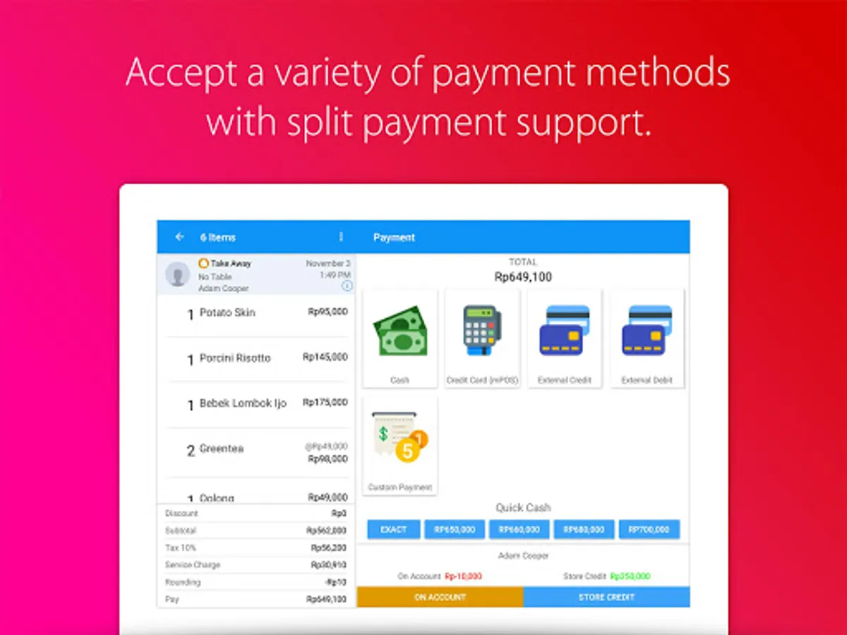 • Accept various payment types, including external debit/credit, gift cards, store credit, account balance, loyalty points, and your own custom payment types.