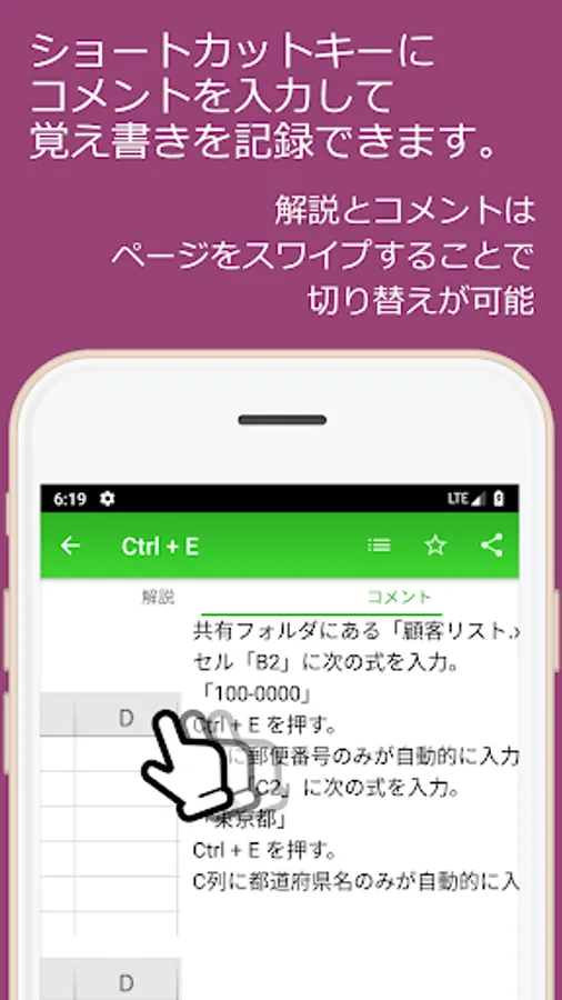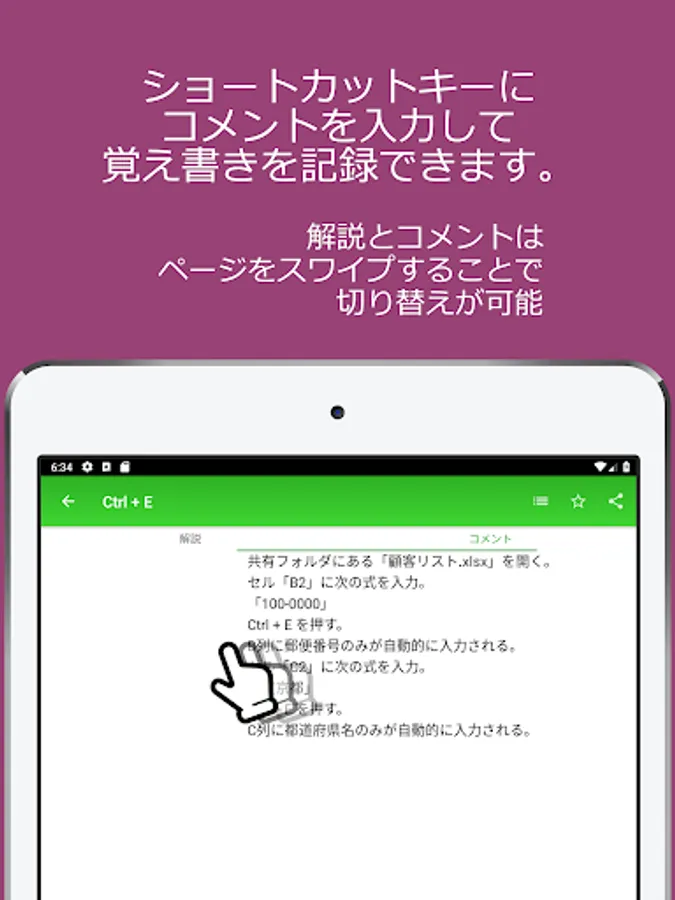 Swipe left on the Excel shortcut key description screen to enter a comment for that shortcut key.