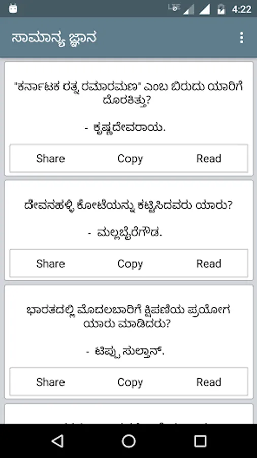 This app (General Knowledge GK Today) contains 1000+ most popular questions and answers, and All questions are in Kannada font
