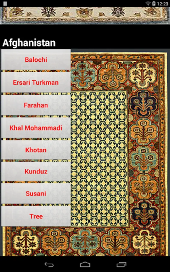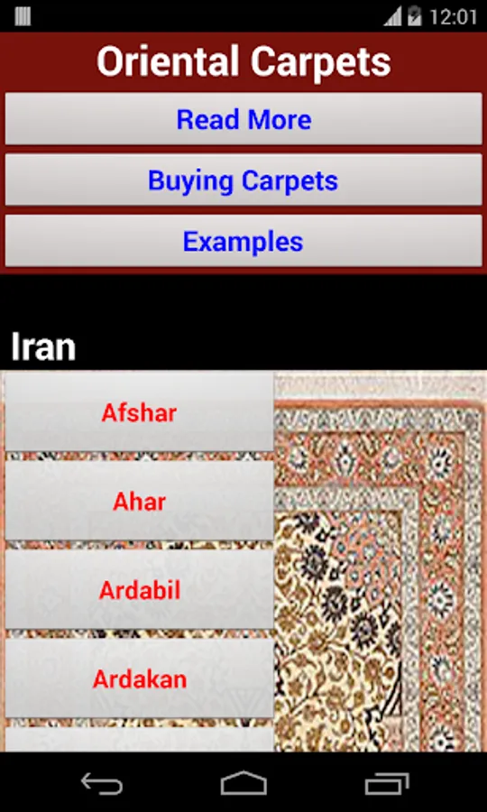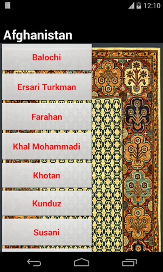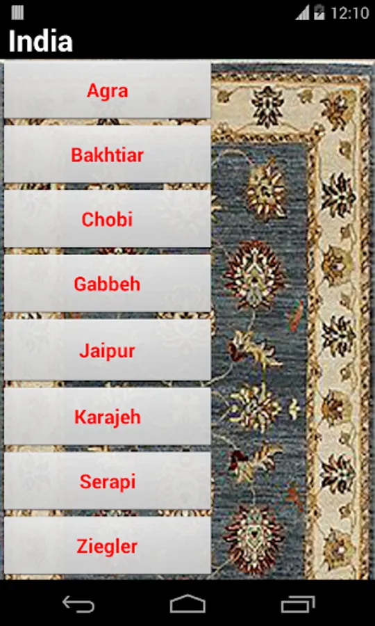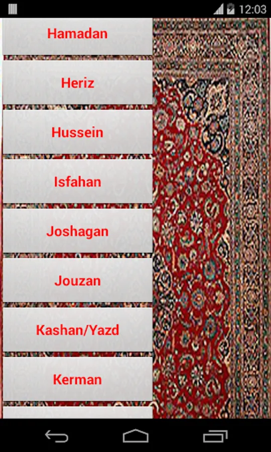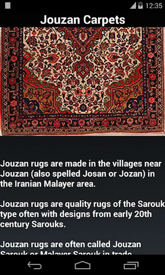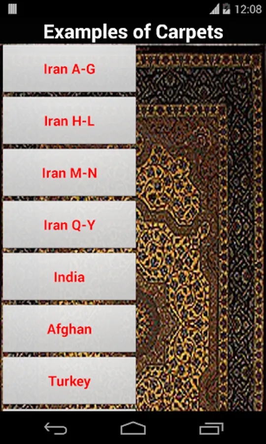 This app provides a visual guide to 50 varieties of Persian rugs from Iran and also of similar products produced in Turkey, India, Pakistan and elsewhere.