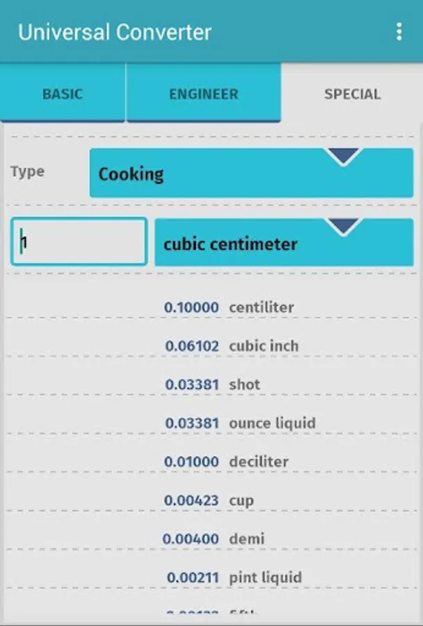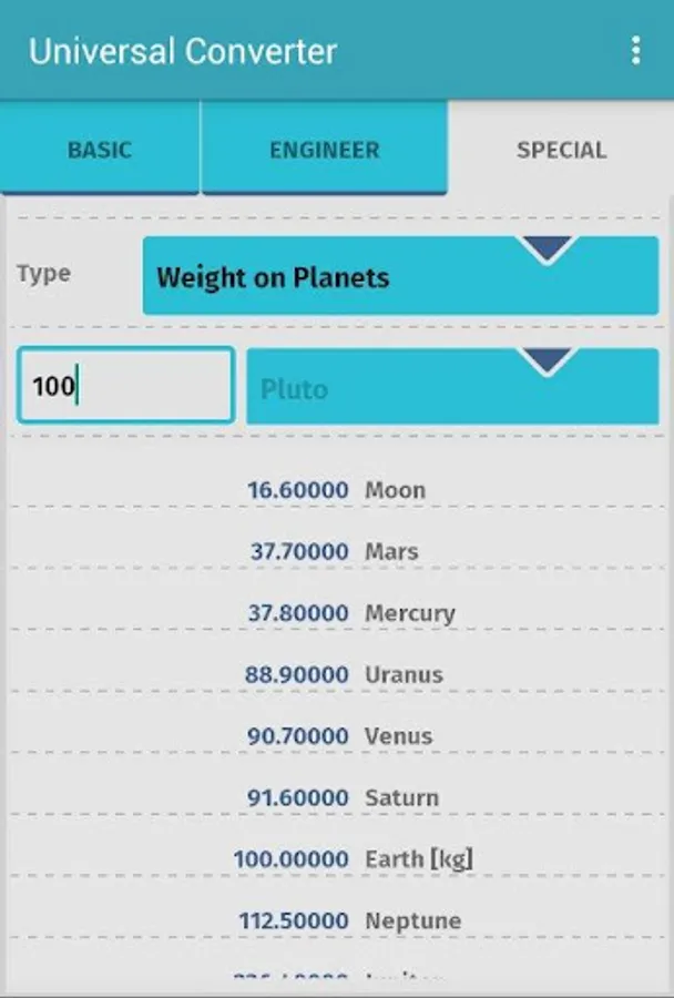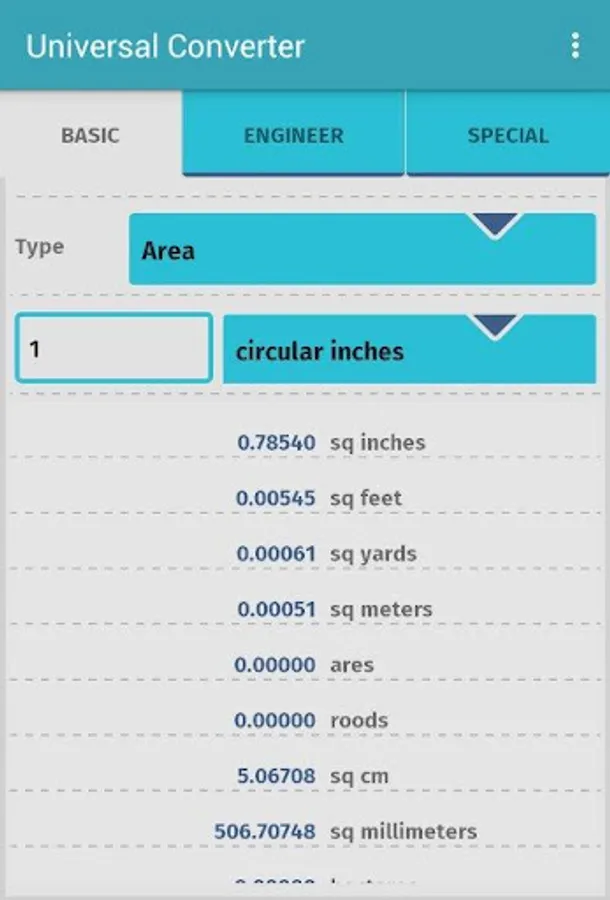 BASIC: Area, Mass, Volume, Speed, Temperature, Density, Energy, Force, Length, Pressure, Time, Bytes, Angle, Torque, Sound, Concentration, Calorific, Velocity