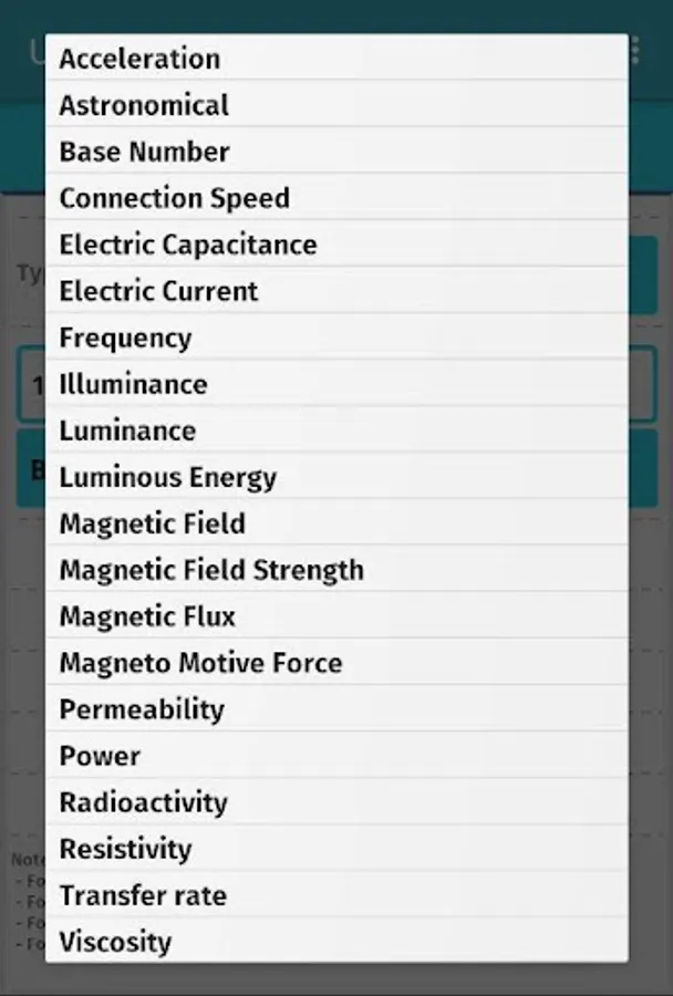 ENGINEER: Power, Astronomical, Electric Current, Electric Capacitance, Radioactivity, Frequency, Illuminance, Luminance, Base Number, Viscosity, Acceleration, Transfer rate, Connection Speed, Magnetic Field, Magneto Motive Force, Magnetic Flux, Magnetic Field Strength, Luminous Energy, Permeability, Resistivity