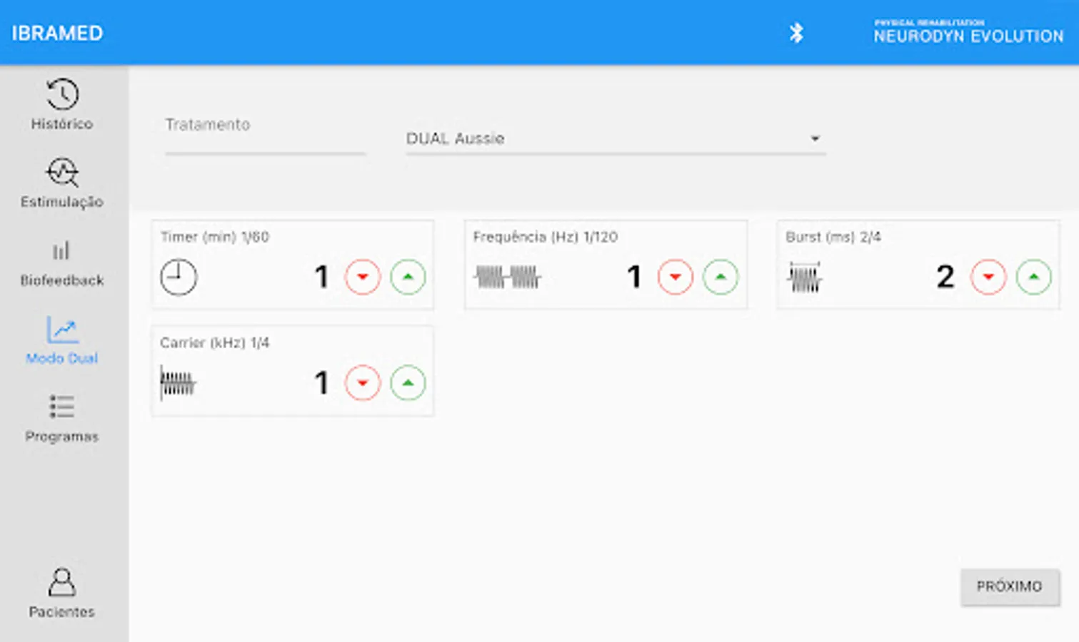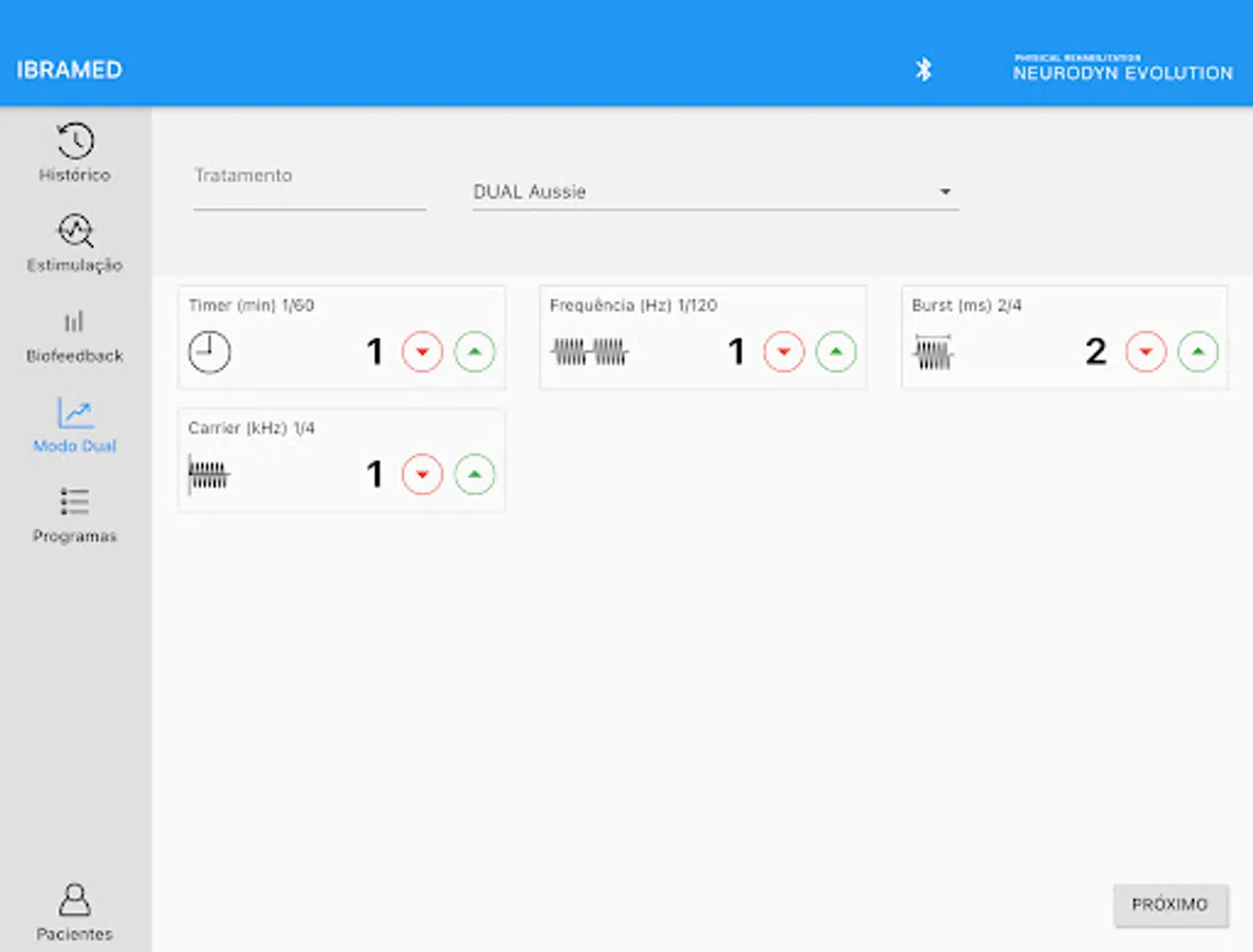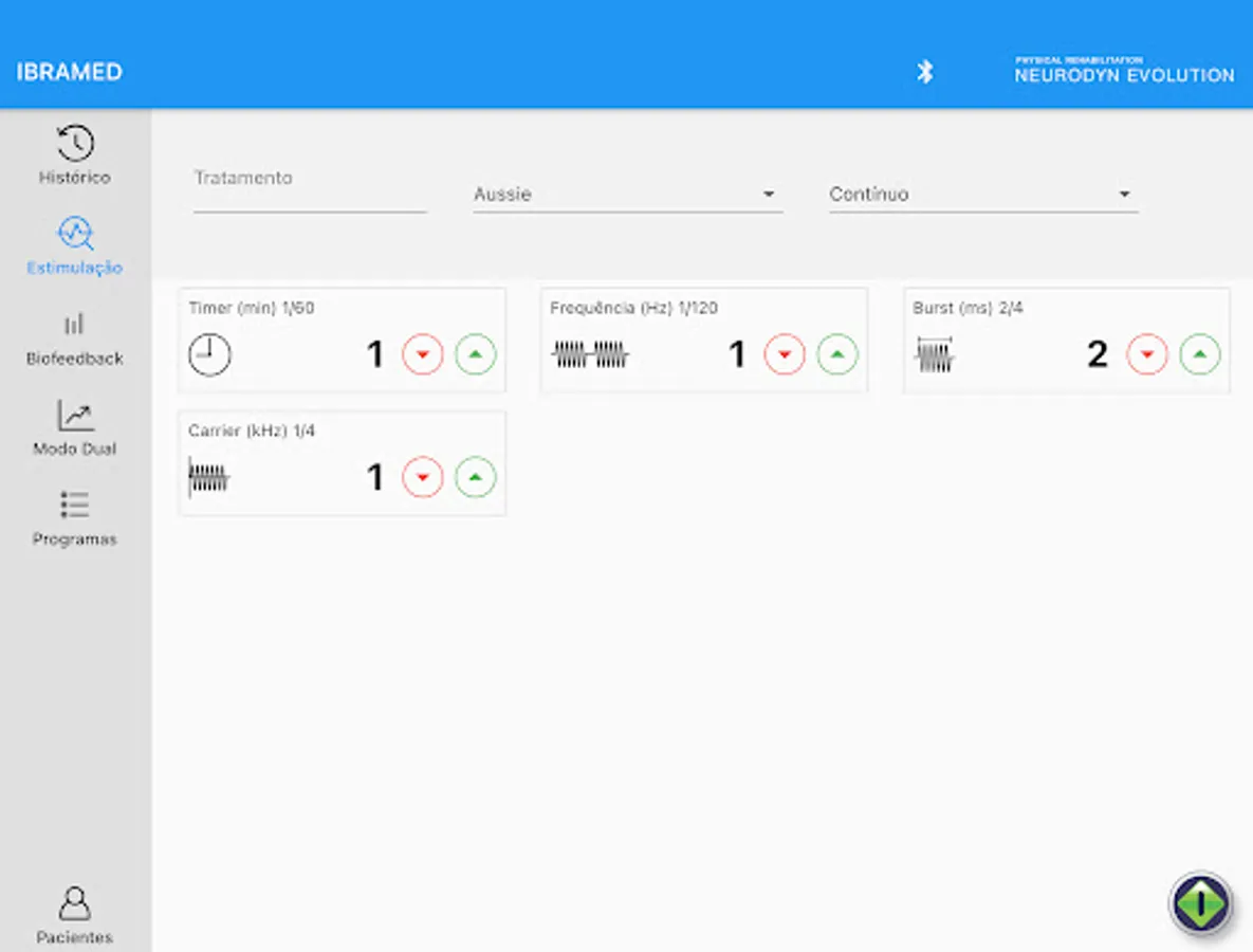 The Neurodyn Evolution application was developed to allow greater practicality for the professional, being possible to program and save the therapies according to the needs of each patient, guaranteeing a better performance in the use of your Neurodyn Evolution.