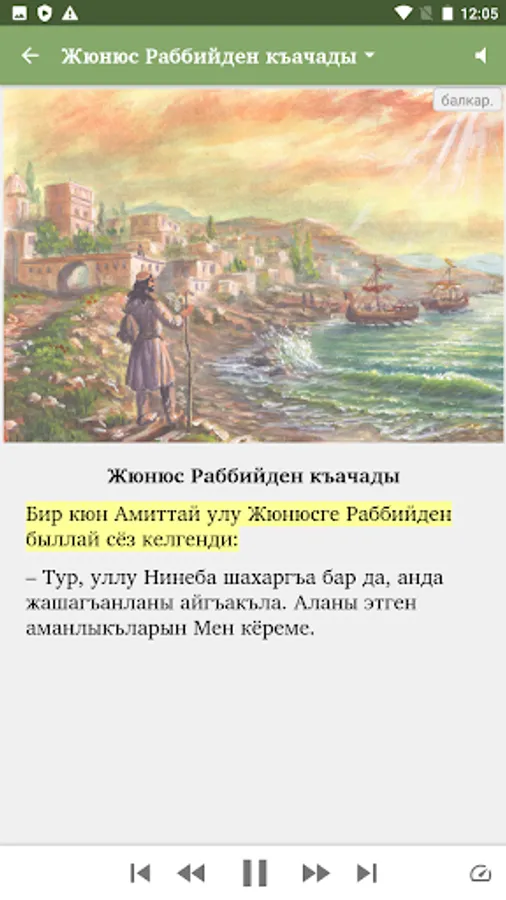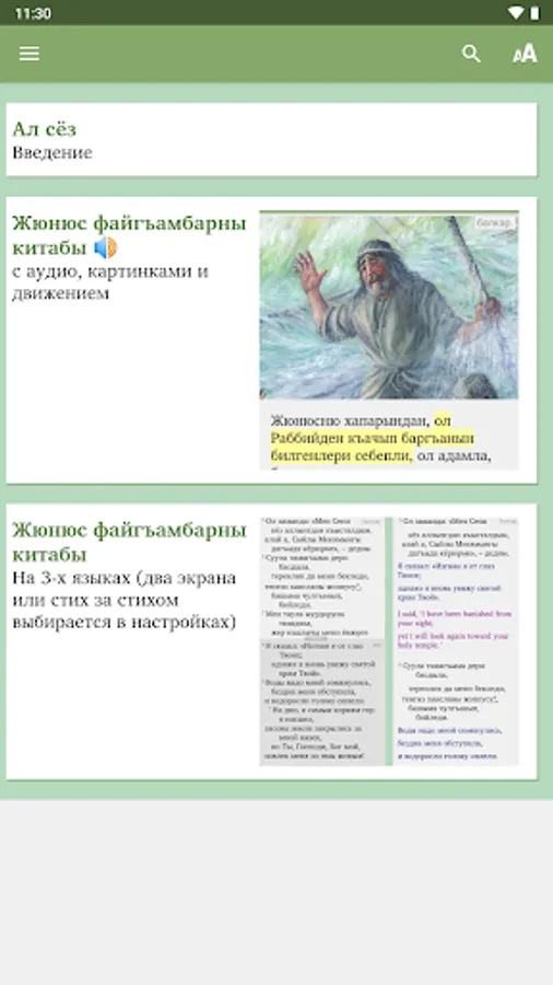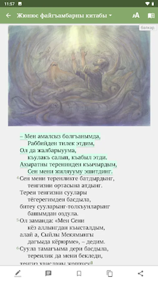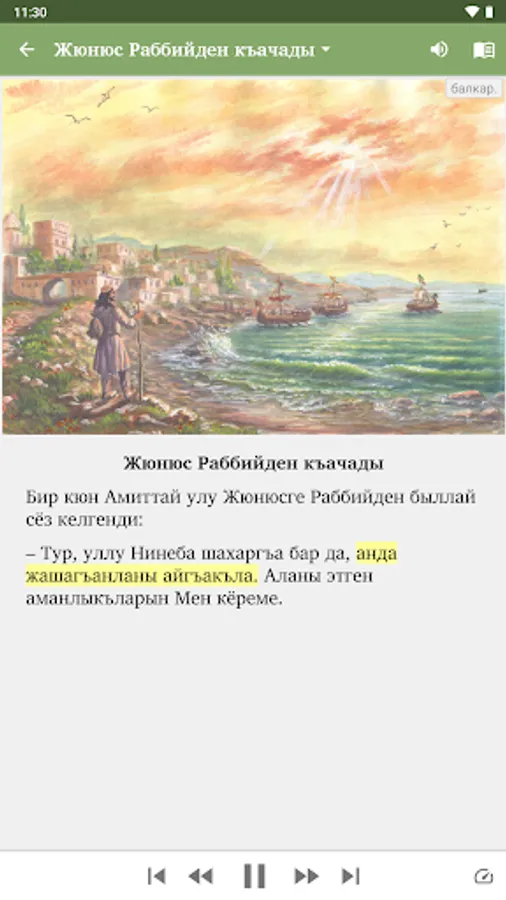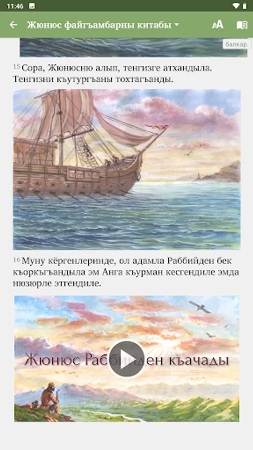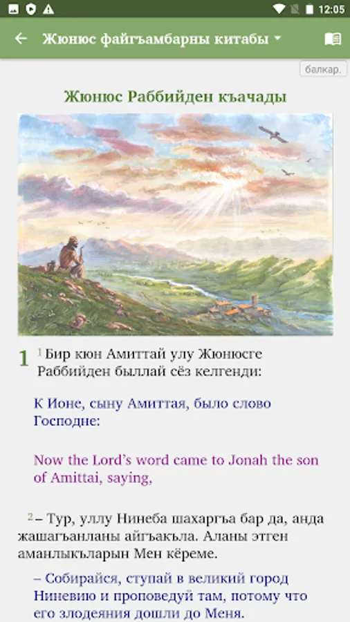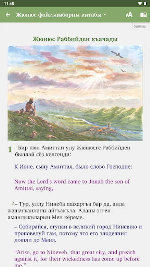 This Scripture app facilitates Bible study in the Balkar language. Users can highlight verses in different colors, place bookmarks, write notes and view their reading history.
