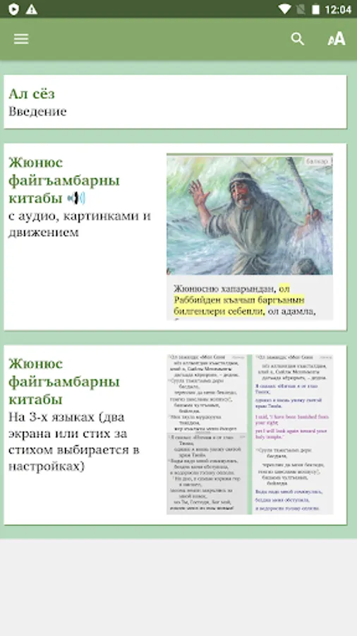 The first part of the app includes audio that has been synchronized with the text (each verse of text is highlighted when the corresponding audio fragment is played, if this option is not turned off in the app's settings). An Internet connection is needed for streaming the audio.