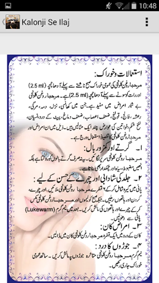 Hum roz marrah ke mamlaat mai choti choti takaleef ko le ker pareshan rehte hen, bachon ko kay/matli hojana, sir mai dard hona, aankhon mai motia ho, kaan ka behrapan, is terhan ki takleef ka hal Kalonji ke terteeb war istemaal mai posheeda hai.