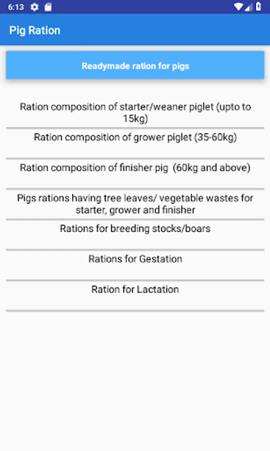 The IVRI-Pig Ration App can help the end users to formulate balanced ration for the various categories of pigs based on the locally available feed ingredients. The app additionally provides for ready diets for different categories of pigs.Use of this Mobile App for balanced pig ration can help to enhance the profitability of the piggery enterprise.