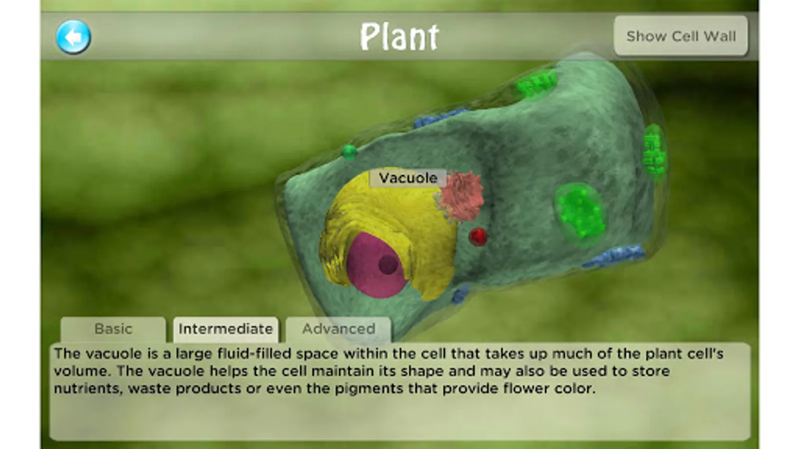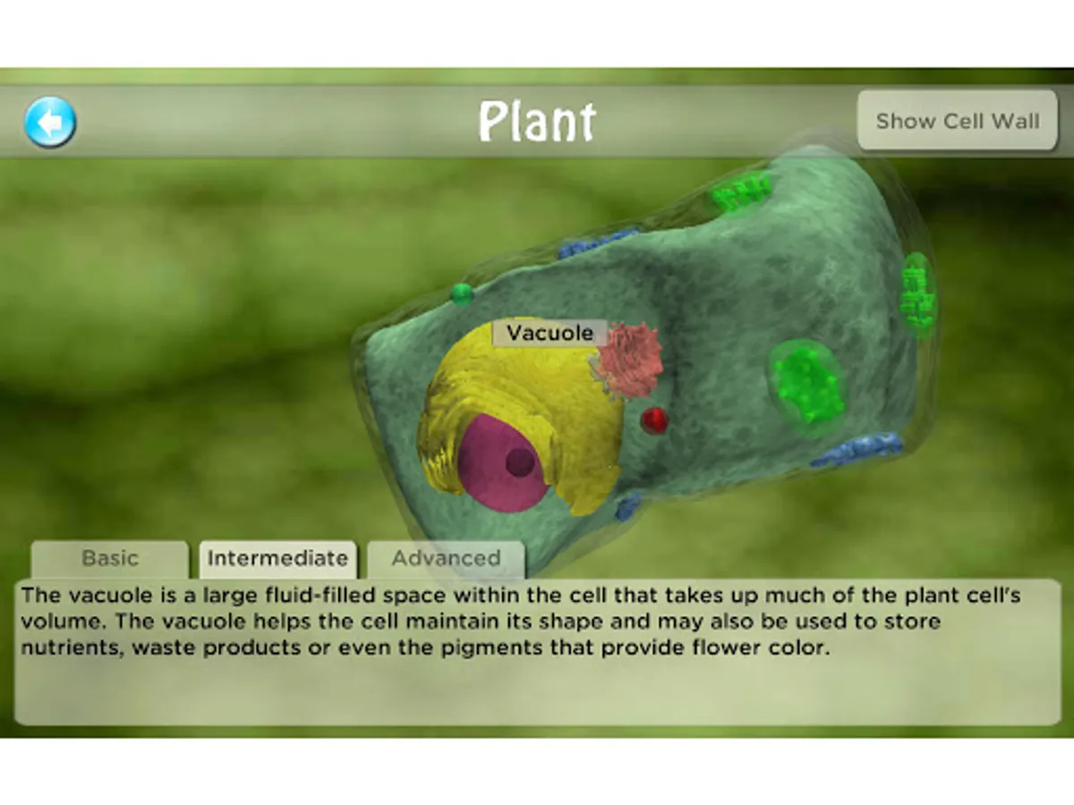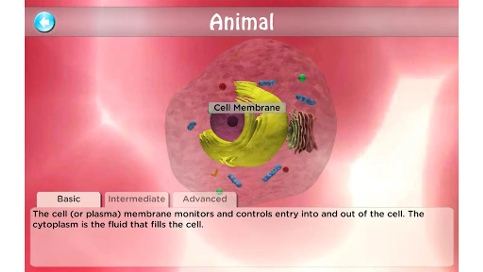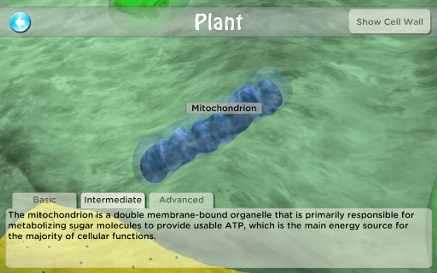You can use your finger to tap on parts of the cell to select and zoom in on that particular organelle. Each organelle comes with a name and a short description of its function in the cell.