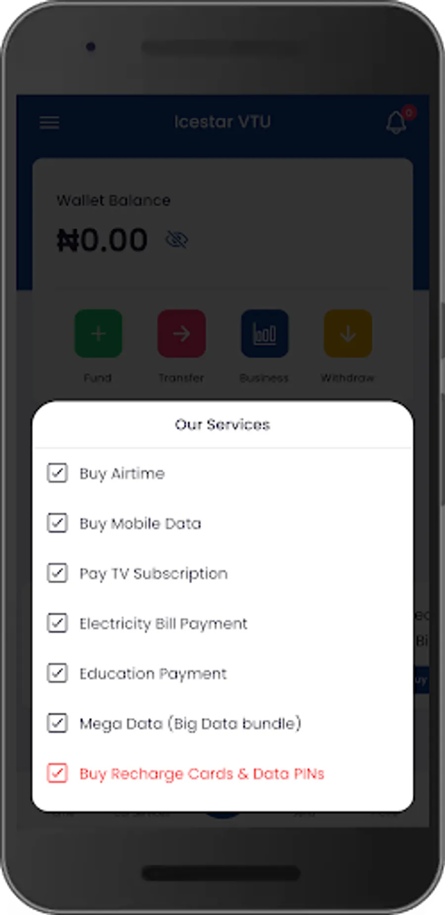 We offer instant recharge of Airtime, Data bundle, CableTV (DStv, GOtv & Startimes), Electricity Bill Payment, Recharge Card Printing and more.