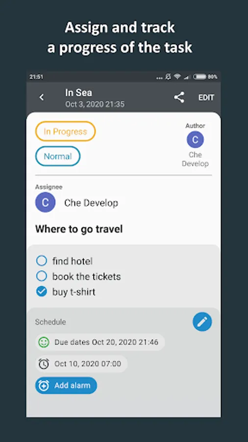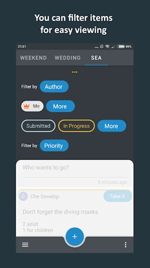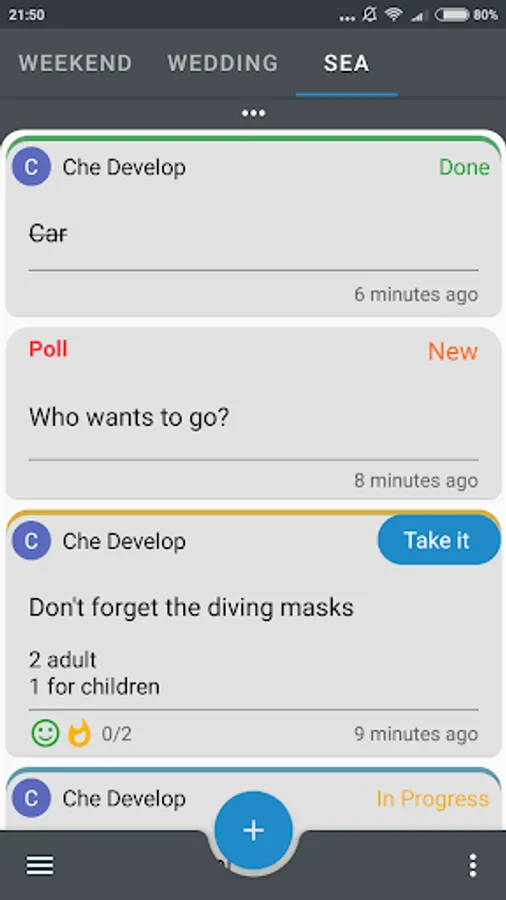 A simple tasks manager for organizing daily work, events and collaboration. Create and share tasks, set goals for collaboration with colleagues, friends or family. Spend less time negotiating and prioritizing. Improve the use of your time. Think about something useful, not something you might have forgotten!
