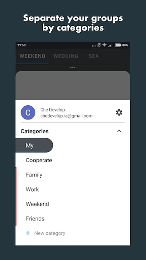 «My» category contains all the groups that you have created. The «collaboration» category displays all groups in which you are added as a member. By creating different categories, you can conveniently separate tasks. By creating such categories like: «travel», «house», «family» etc.
