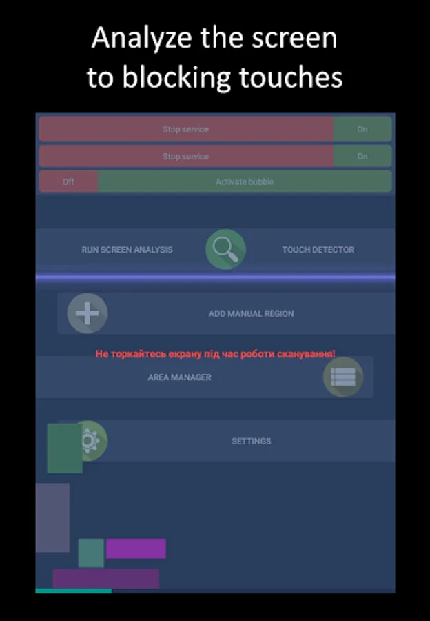 After the automatic screen analysis running, all touches are intercepted for the established time interval to identify the lock zones. (DO NOT TOUCH THE SCREEN DURING ANALYSIS RUNNING!)