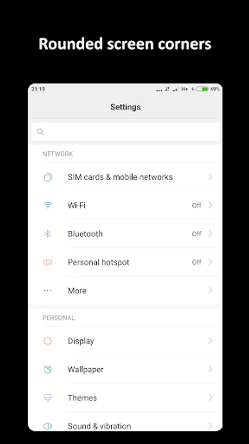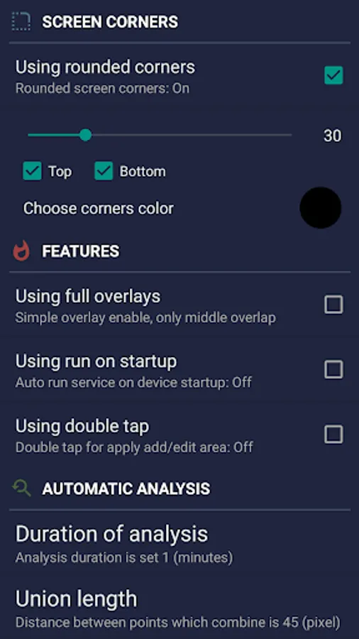 Also available function of rounding the corners of the screen, in the settings it is possible to choose the color and radius. Added rounded corners of the screen are displayed on top of all possible elements.