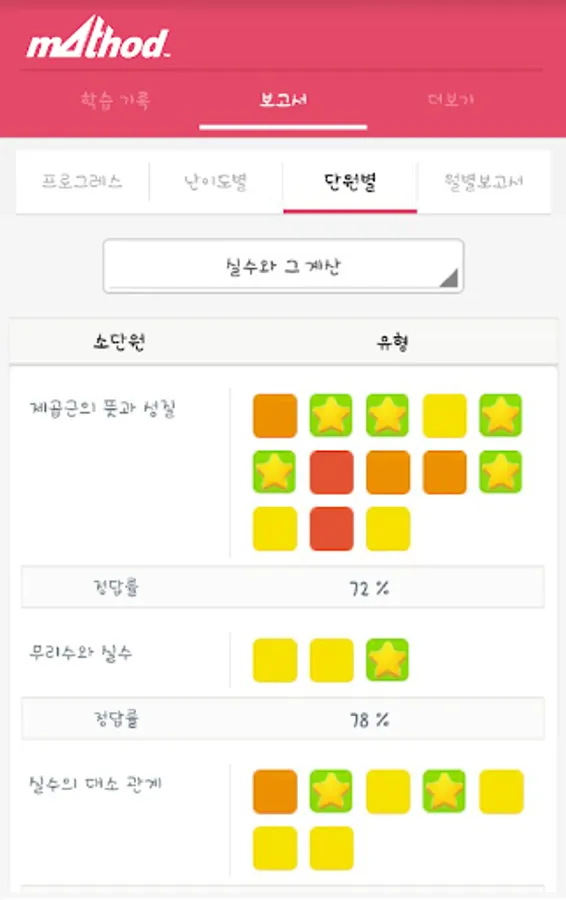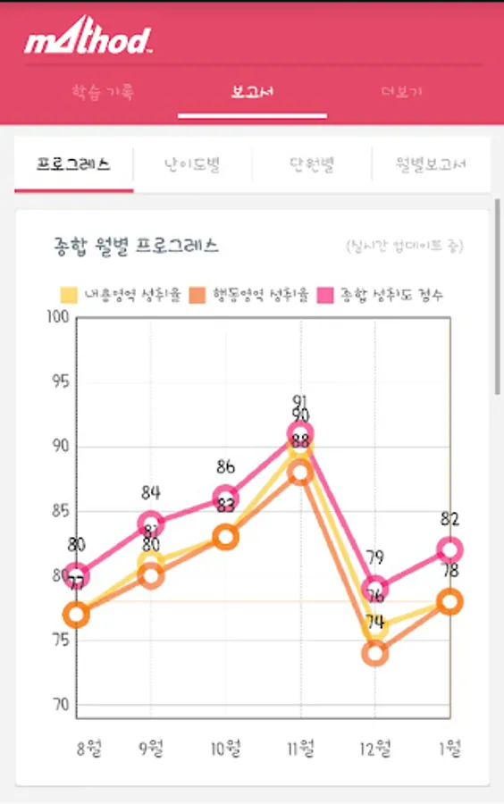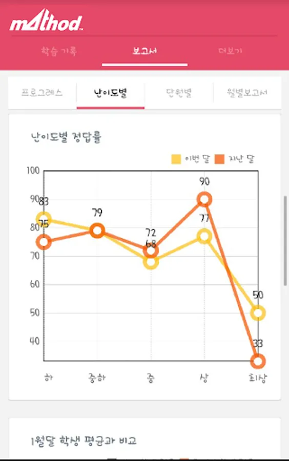 매쏘드수학학원에서는 달마다 아이의 학업 보고서를 작성해 학부모님께 전달합니다. 아이의 문제 풀이 결과를 도표와 그래프 등을 통해 알기 쉽게 정리해서, 아이의 현재 학습 상태를 진단하기 위해서인데요.