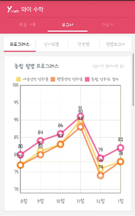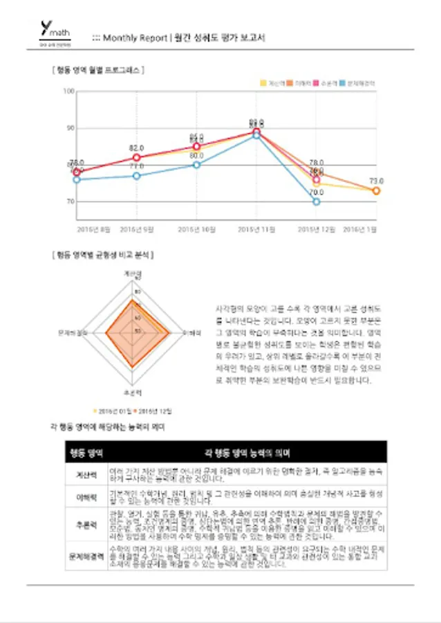 우리 아이가 한 달간 와이수학에서 무엇을 공부했고, 어느 유형이 취약한지, 향후 중점 보완해야 할 곳은 어디인지 등을 담은 종합 학습 보고서를 편하게 받아보세요.