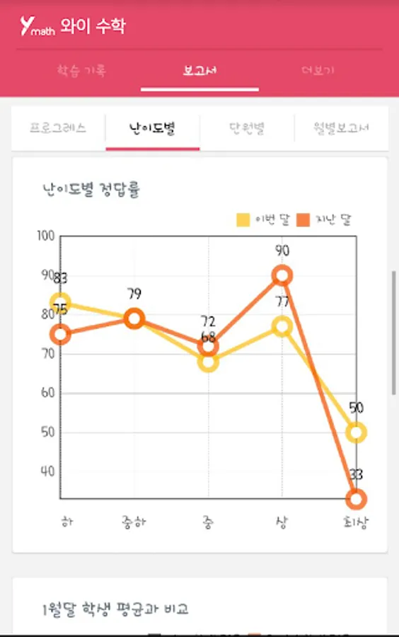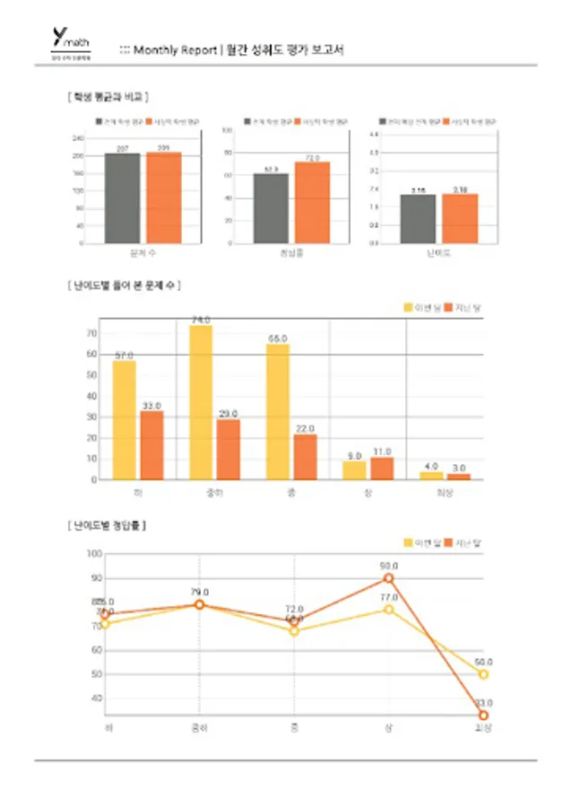 와이수학에서는 달마다 아이의 학업 보고서를 작성해 학부모님께 전달합니다. 아이의 문제 풀이 결과를 도표와 그래프 등을 통해 알기 쉽게 정리해서, 아이의 현재 학습 상태를 진단하기 위해서인데요.