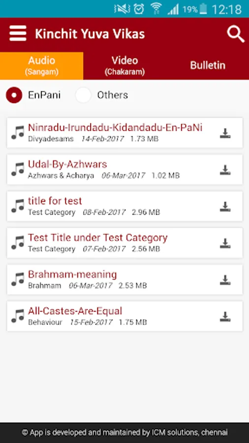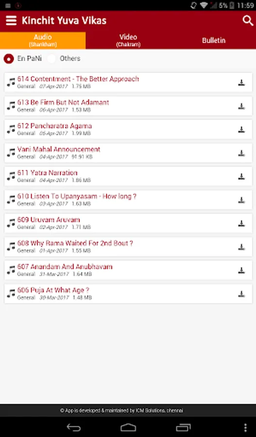 This app, Kinchit Yuva Vikas part of Kinchitkaram Trust, is where U.Ve. Velukkudi Krishnan Swamy talks on various subjects that are of interest to members. Please share your feedback using the Feedback link available in the app itself.