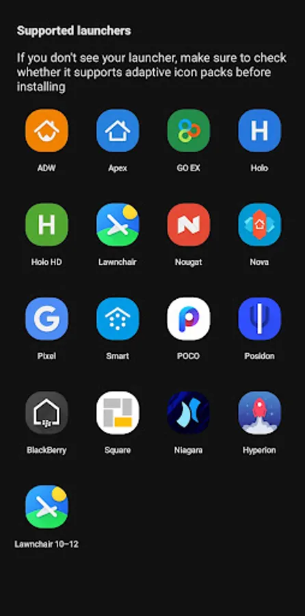 ABC, Action, Atom, Aviate, Evie, Flick, Lucid, M, Microsoft Launcher, Mini, Next, Google Pixel Launcher, Solo, Zero. Most of pre-installed launchers are not supported either. Please check if your system launcher supports dynamic icons before purchasing.