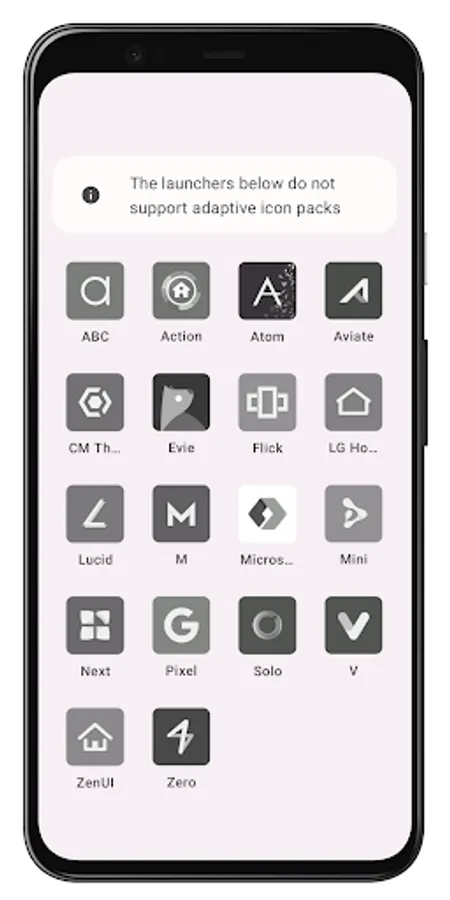 ABC, Action, Atom, Aviate, Evie, Flick, Lucid, M, Microsoft Launcher, Mini, Next, Google Pixel Launcher, Solo, Zero. Most of pre-installed launchers are not supported either. Please check if your system launcher supports dynamic icons before purchasing.