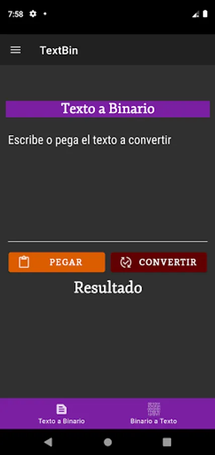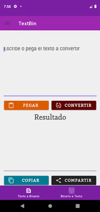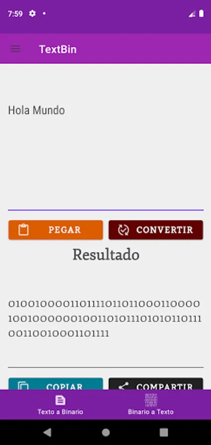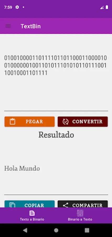 The app has buttons to make conversion, paste or copy easier, and above all share either the message or the binary code.