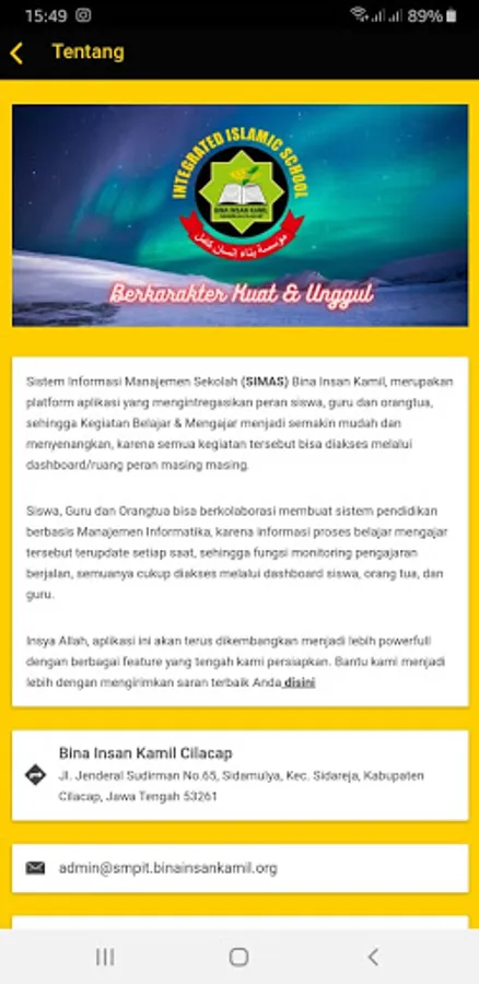 Student Attendance Management: Admin and teacher can do all attendance management every day of students in each class. The attendance method used is FACE RECOGNITION *, so that students cannot be absent / due to attendance based on face scans. Students and parents can view the attendance date report wisely. The teacher can also add reasons for his absence to individual students. Each time a student is absent, an automatic message is sent to the registered parent stating the day, date and reason for the absence.