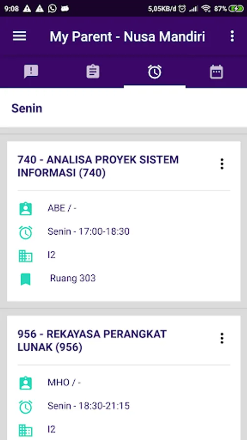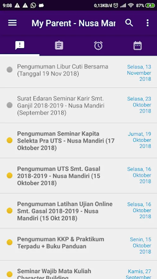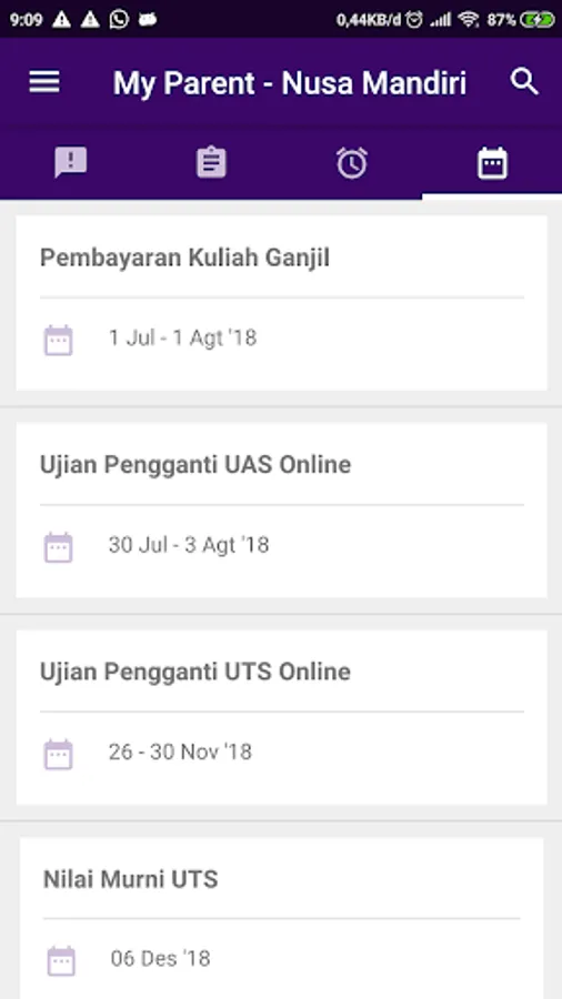 My Parent is an application provided by Nusa Mandiri University to parents of Nusa Mandiri University students to find out information about campus, class schedules, study results and payment status. It is hoped that this application can help parents in getting information about their children's academics.
