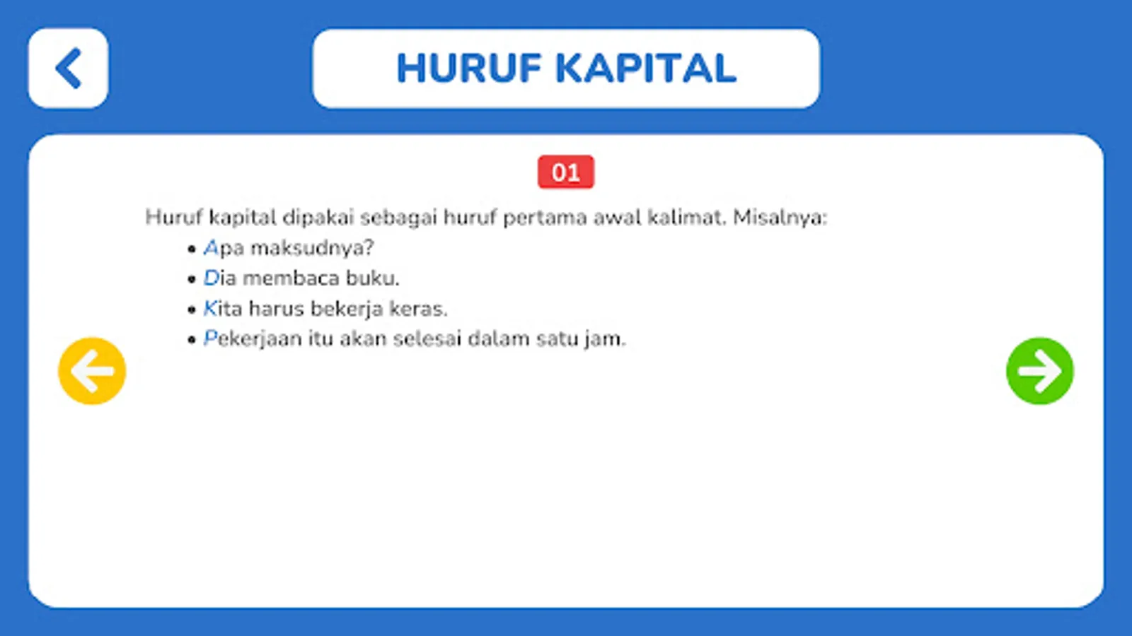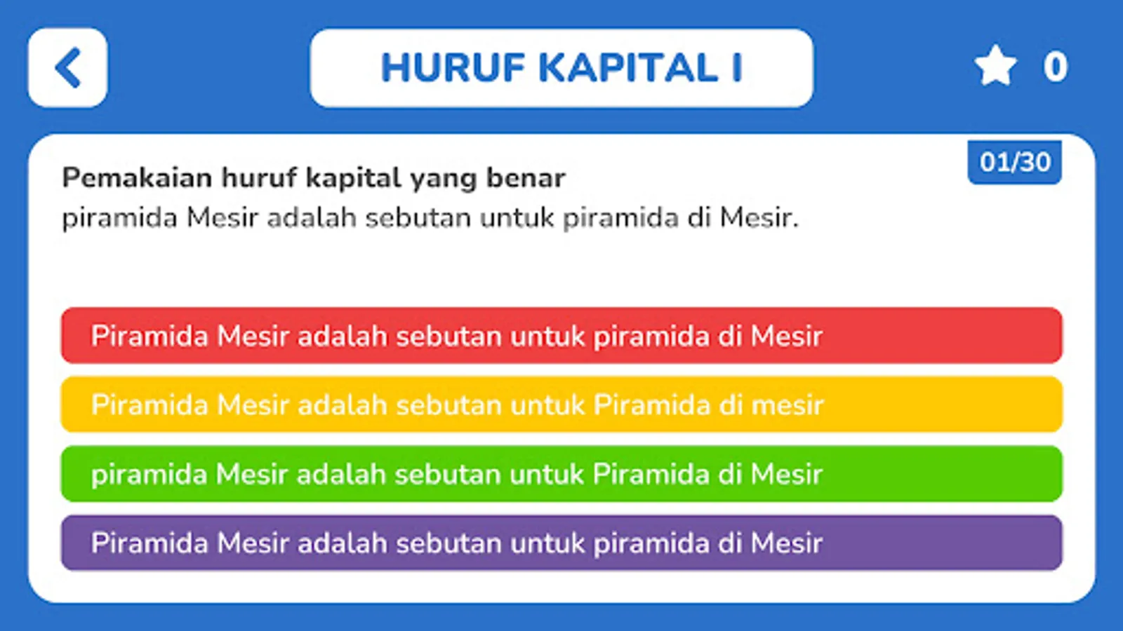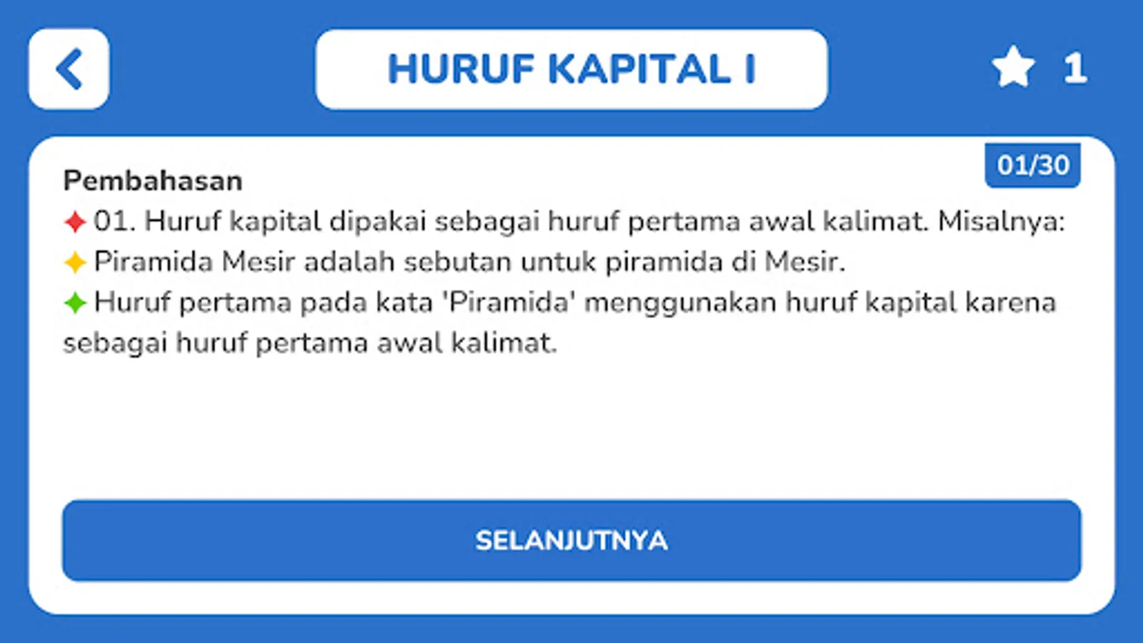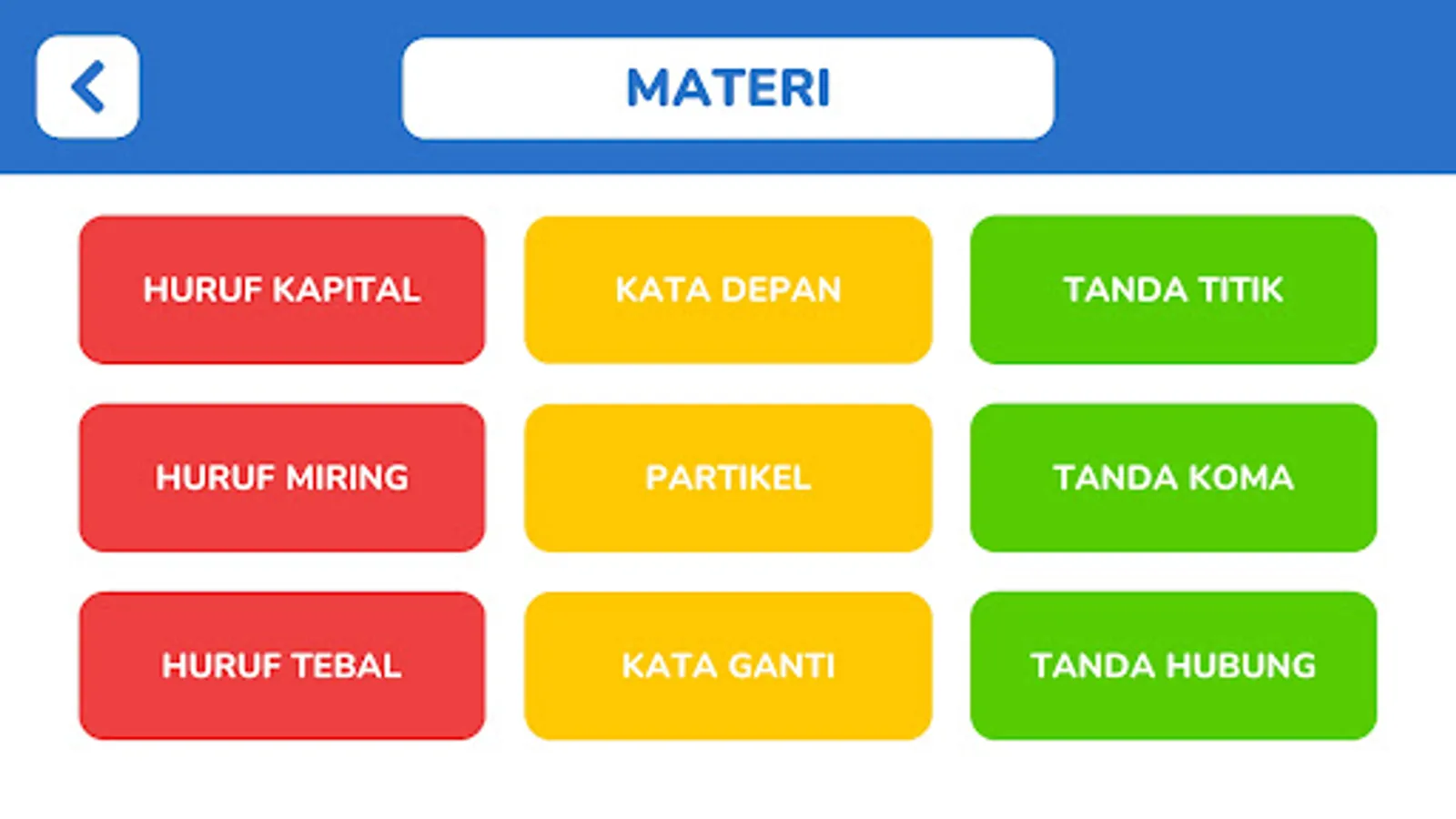 The Material Menu and Quiz Menu consist of three material and quiz chapters, namely: Letters, Words, and Punctuation. There are also nine sub-chapters of materials and quizzes, namely: Capital Letters, Italics, Bold Letters, Prepositions, Particles, Pronouns, Periods (.), Comma (,), and Hyphens (-).