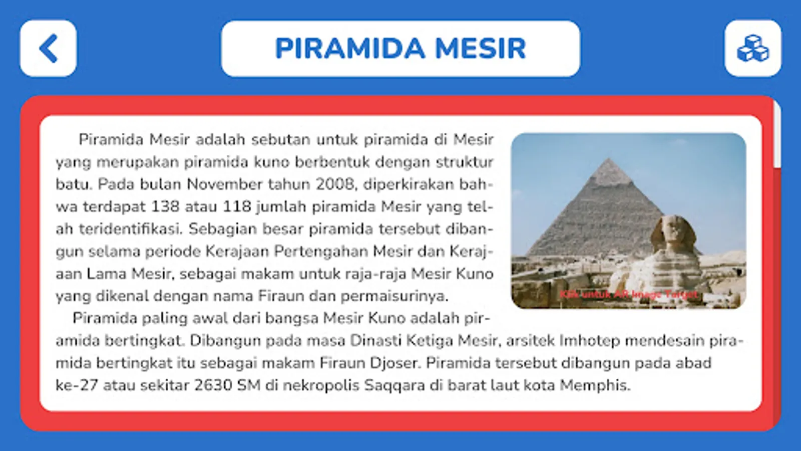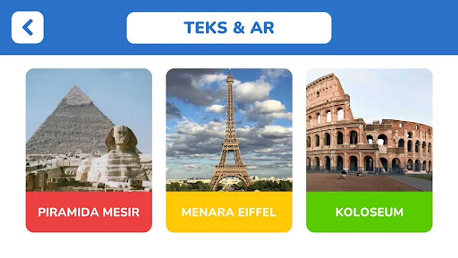 The Text & AR menu offers three general knowledge texts: the Egyptian Pyramids, the Eiffel Tower, and the Colosseum. In each text there is a discussion based on PUEBI as well as an augmented reality feature that creates three-dimensional objects to visualize objects in the text.