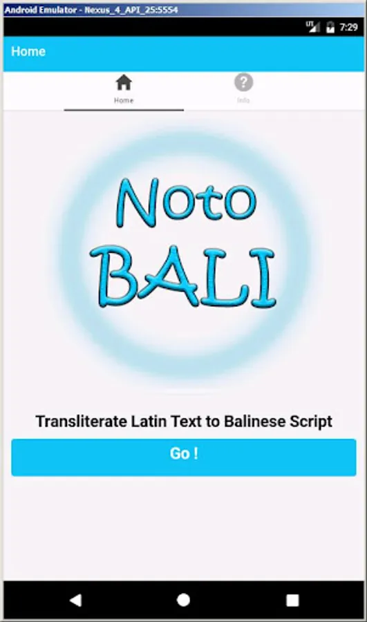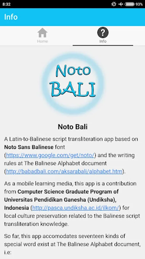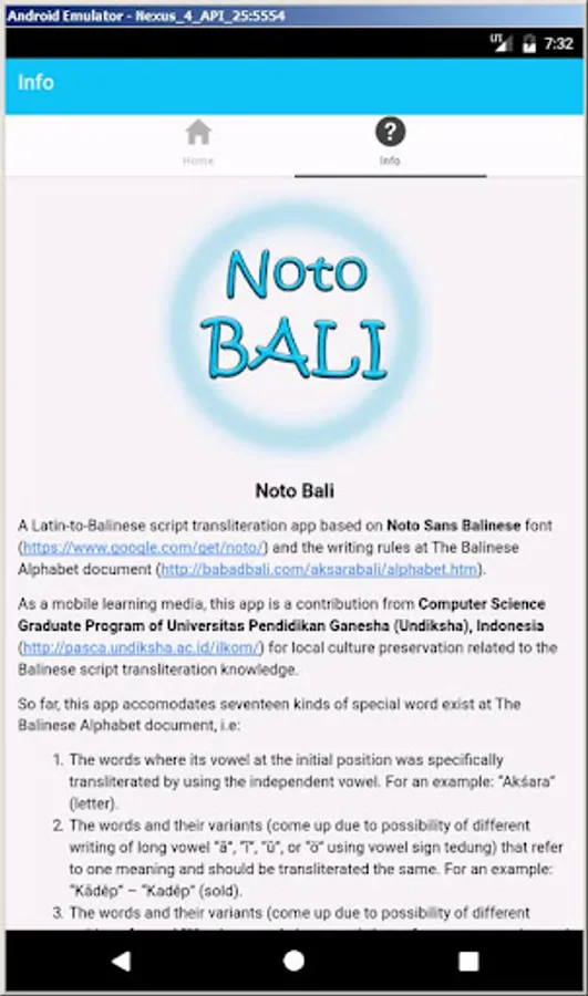 As a mobile learning media, this app is a contribution from Computer Science Graduate Program of Universitas Pendidikan Ganesha (Undiksha), Indonesia (http://pasca.undiksha.ac.id/ilkom/) for local culture preservation related to the Balinese script transliteration knowledge.