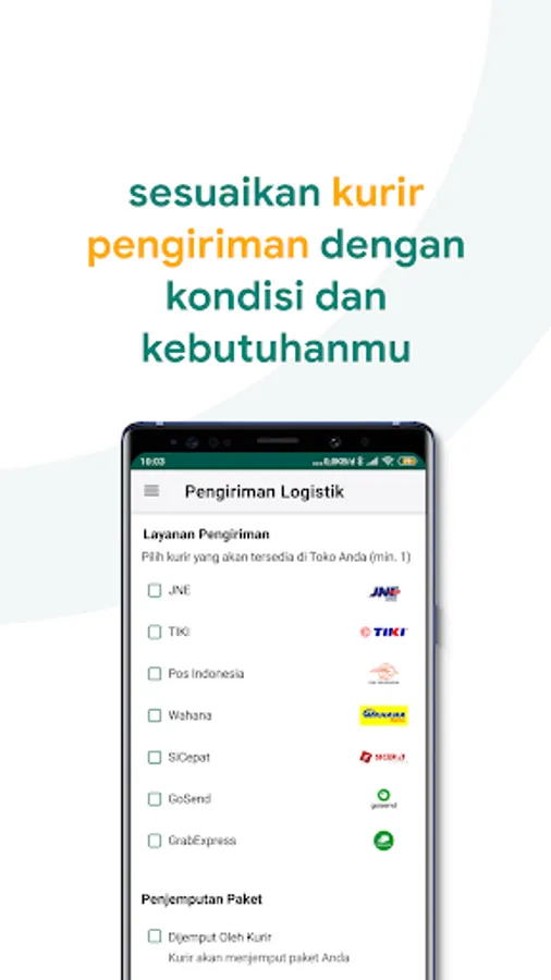 Atur layanan logistik pihak ketiga untuk toko kamu. Repot mengantarkan paket ke agen logistik terdekat? Aktifkan layanan penjemputan paket atau pickup ke toko kamu