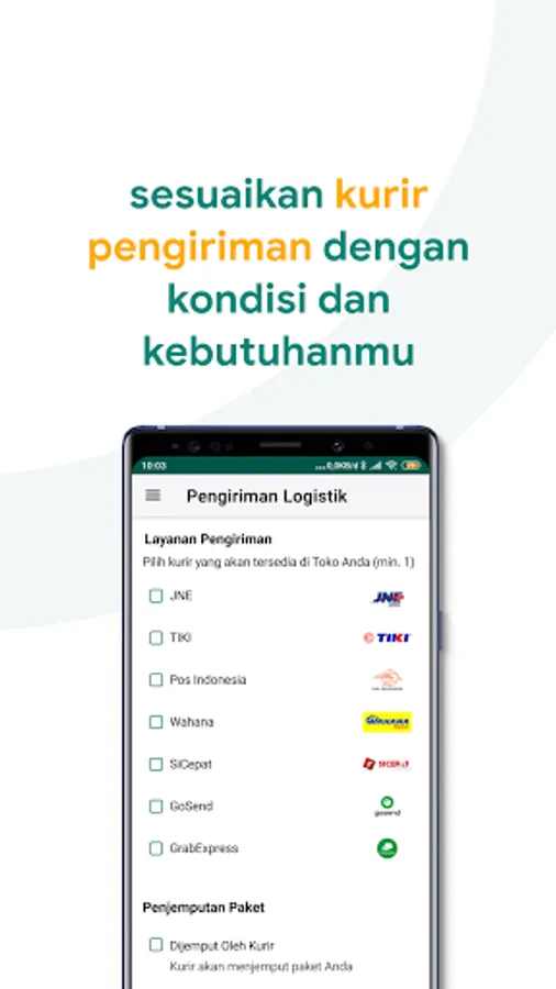 Atur layanan logistik pihak ketiga untuk toko kamu. Repot mengantarkan paket ke agen logistik terdekat? Aktifkan layanan penjemputan paket atau pickup ke toko kamu