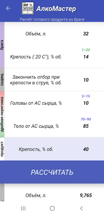 - calculation of the amount of the finished product from the mash with the output of intermediate calculations of the parameters of the raw material and the main fraction of the future distillation.