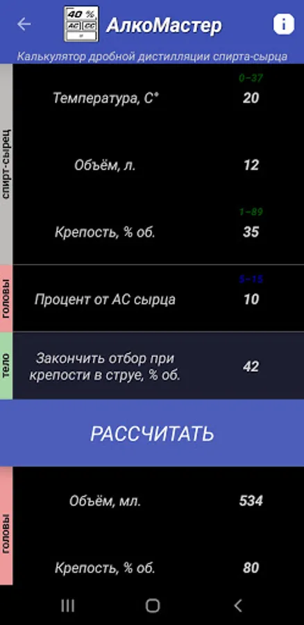 - fractional distillation calculator No. 1: calculation of the number and strength of heads and body, selection of heads as a percentage of raw AS, end of body selection according to the strength in the stream specified by the user, calculation of the remainder in the cube.