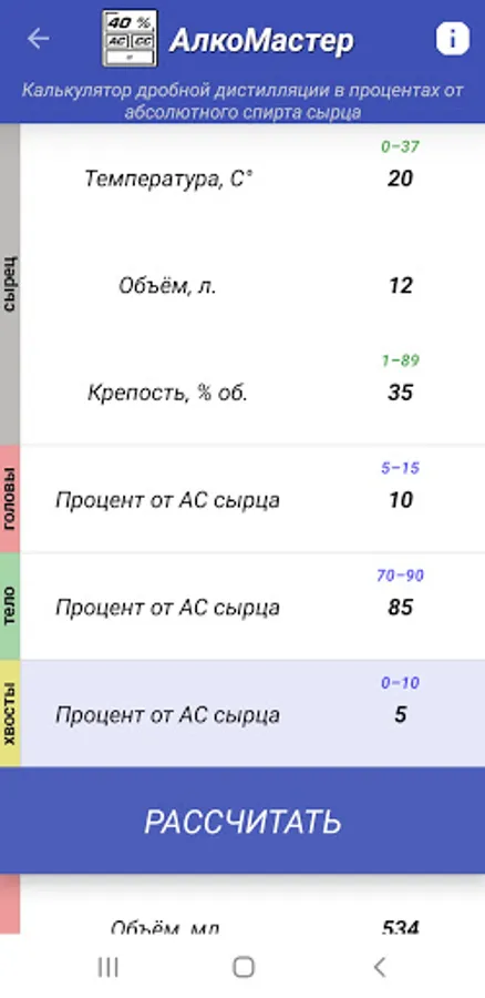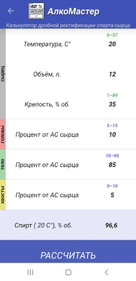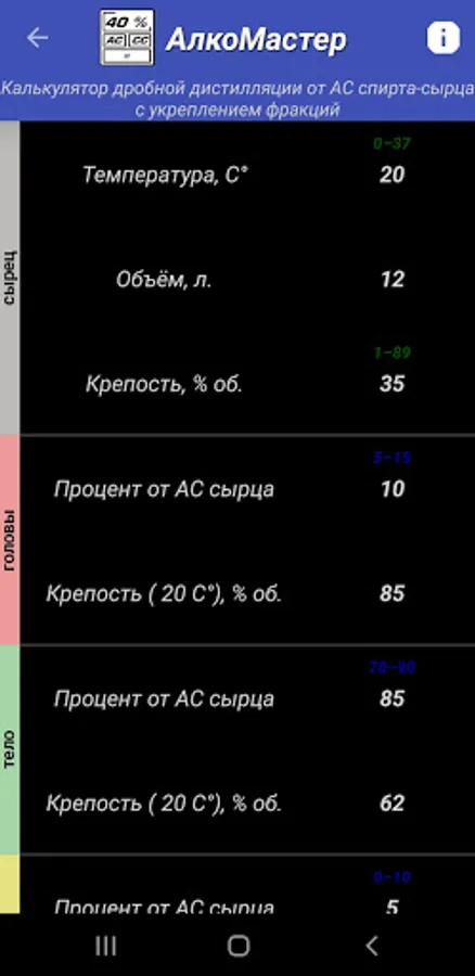 - fractional rectification calculator: calculation of the number of three fractions, selection of fractions as a percentage of the raw AU and the specified alcohol strength at the output.