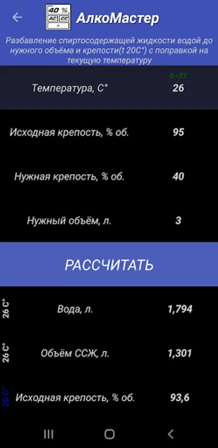 Most of the calculations are based on interpolated data from alcoholometric tables of water-alcohol solutions, which gives sufficient accuracy of the calculation results.