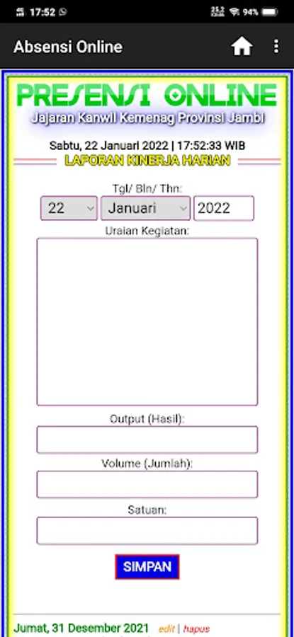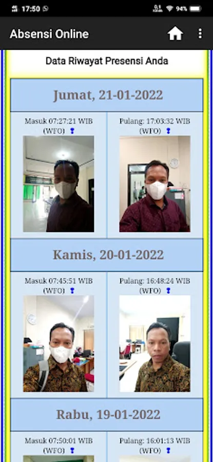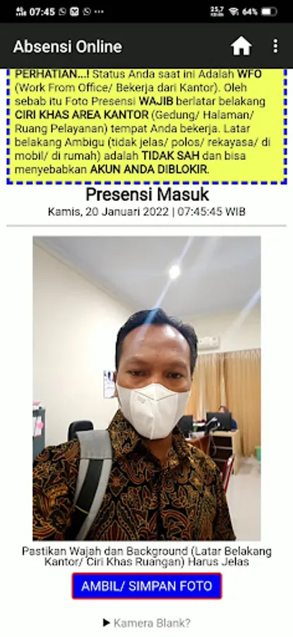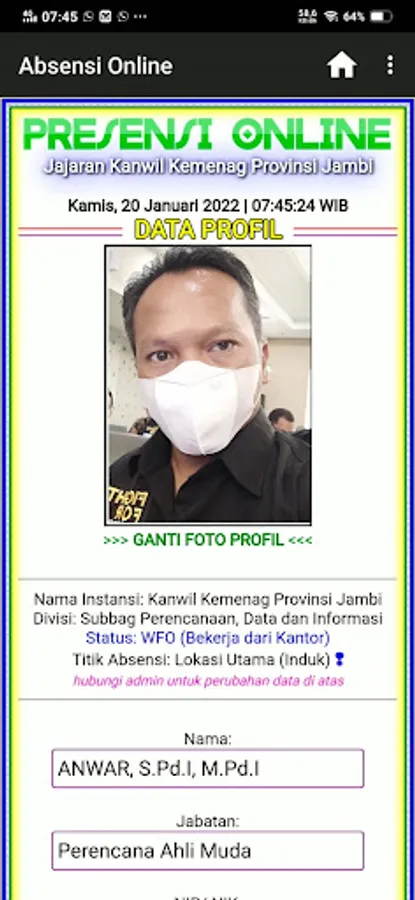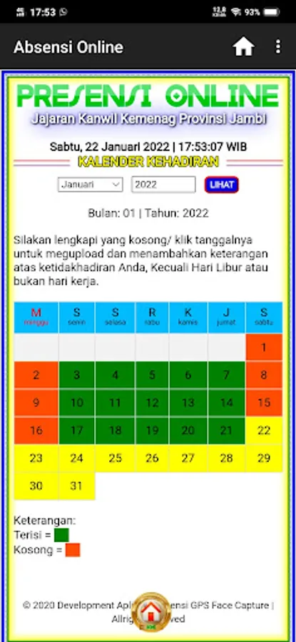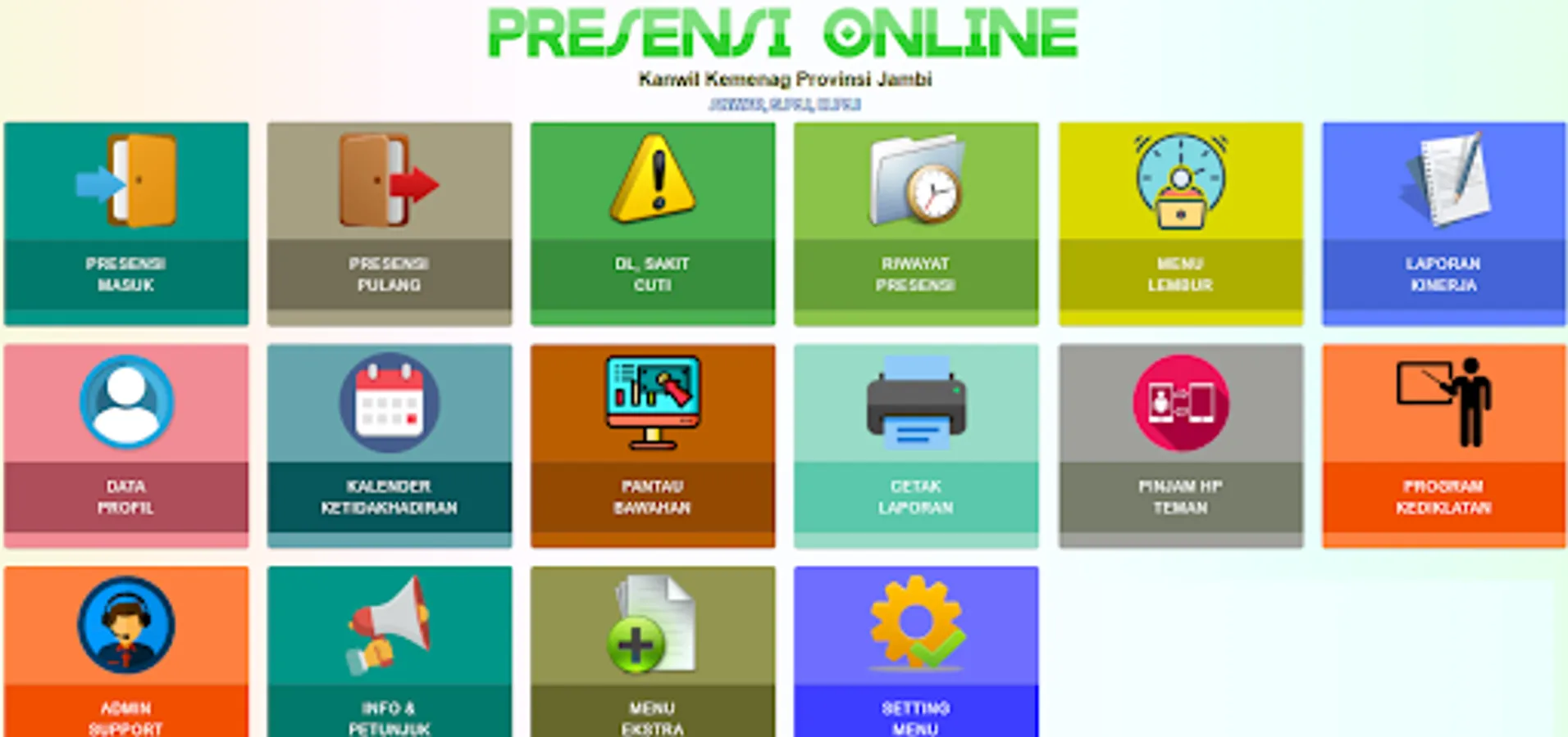 Online attendance (Work From Office and Work From Home). For the State Civil Apparatus (ASN). In connection with Adjustment of Employee Work Systems as Efforts to Prevent the Spread of Corona Virus Disease 2019 (Covid-19). Equipped with daily performance reports, easily monitored in real time by leaders / superiors.