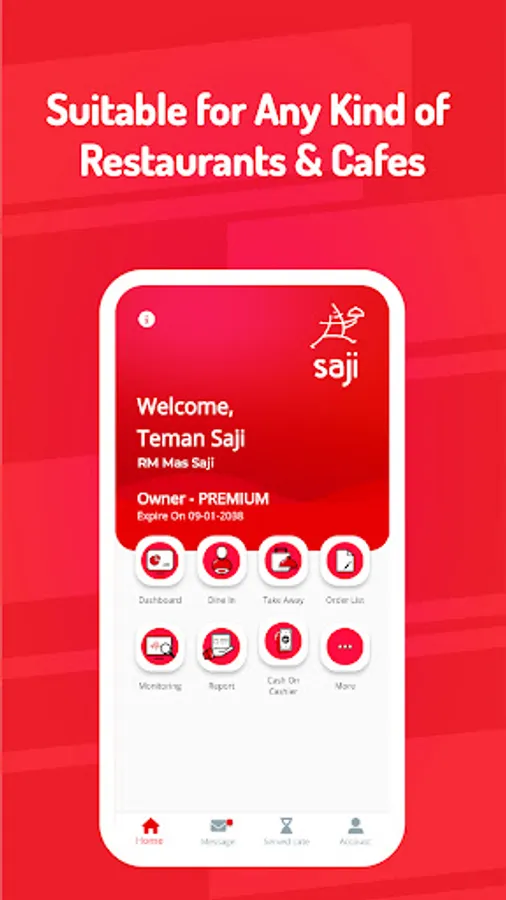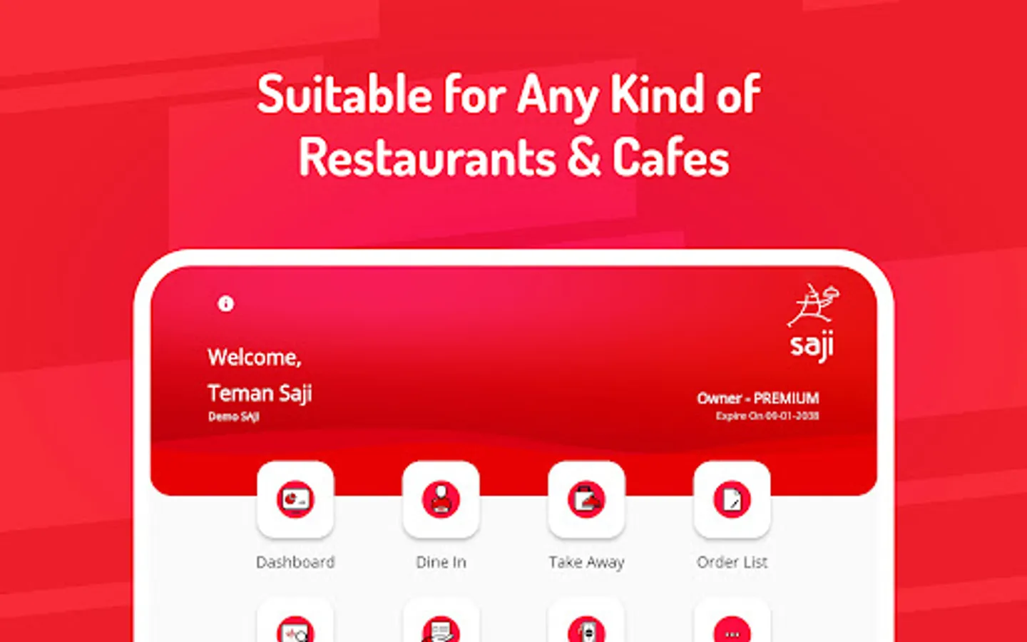 Using only a smartphone or tablet and no significant hardware investment requirements, Saji is also good for many kinds of various food and beverage enterprises, such as cafe, food courts, coffee shops, depots, food stalls, food trucks, franchises, UMKM, cake shops, etc.