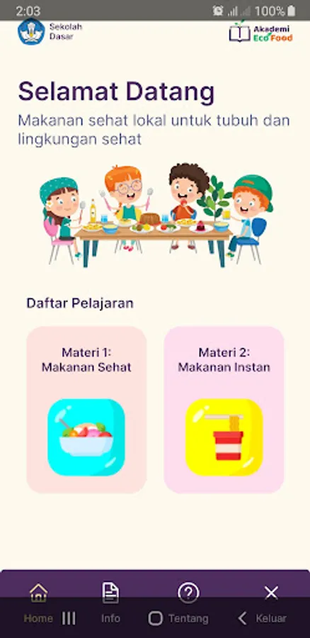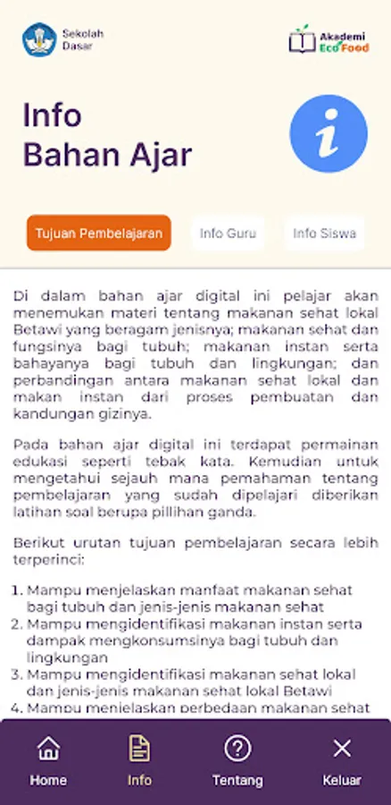 The EcoFood Academy is an application developed to present teaching materials based on Betawi local wisdom. In this application, you will find subject matter that is presented with several forms of media and is interactive.