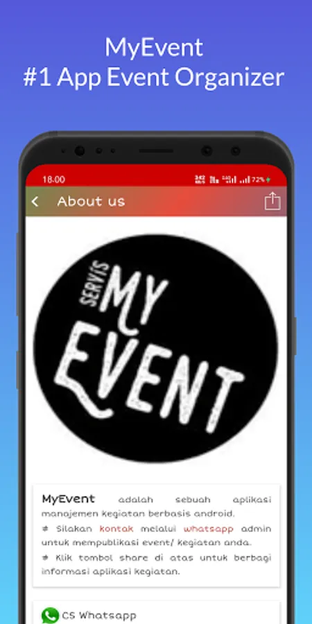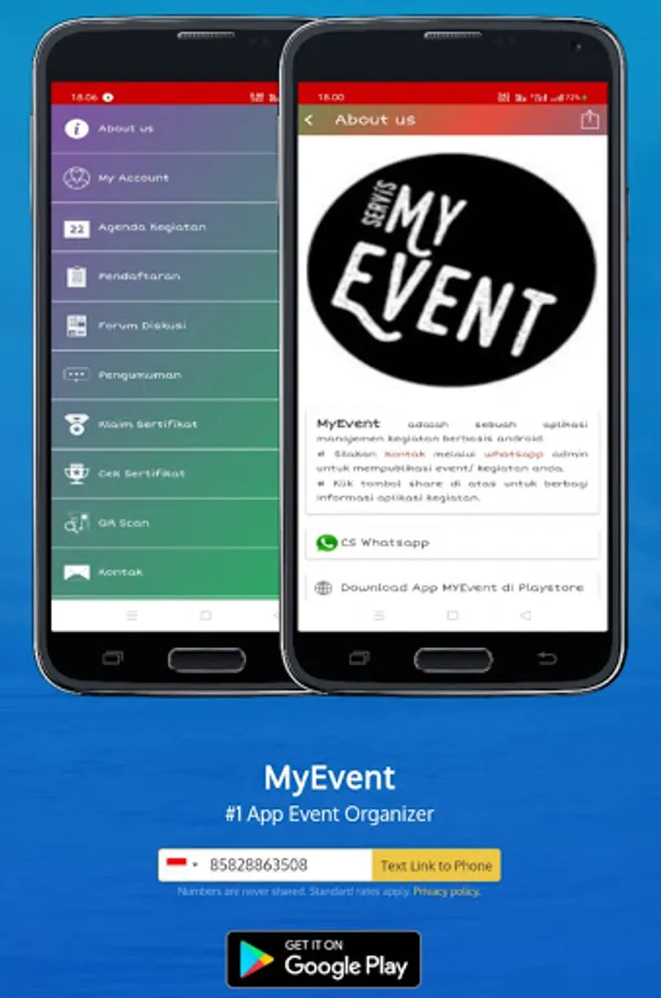 MyEvent is an application to facilitate the management of activities (event organizers). It is suitable for seminars, workshops, sports competitions, performing arts, organizational activities, campuses, schools, agencies, companies, and others.